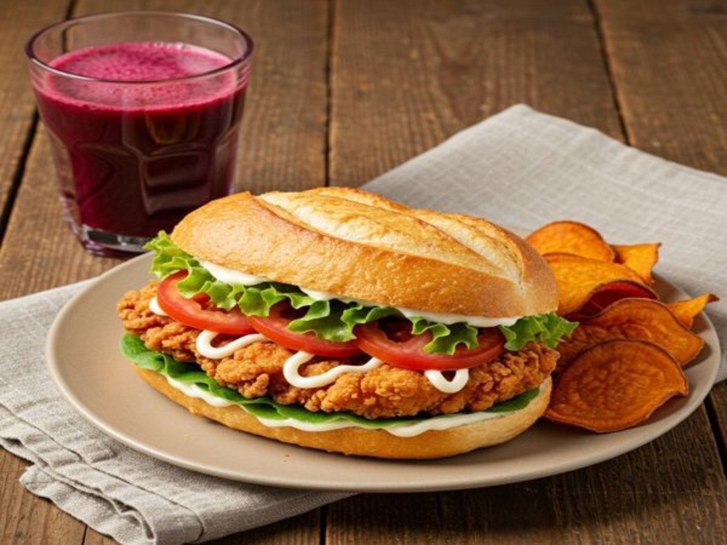 El clásico pan francés con Milanesa de pollo apanada, lechuga romana, tomate y mayonesa.