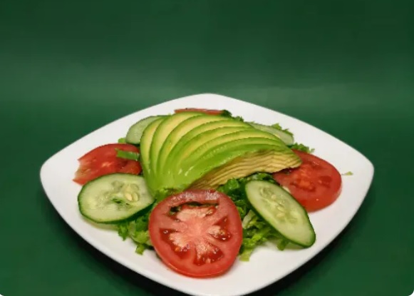 Ensalada hecha a base de lechuga orgánica, pepinillo, tomate y palta.