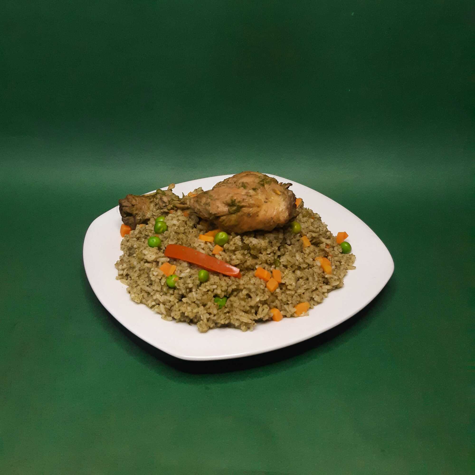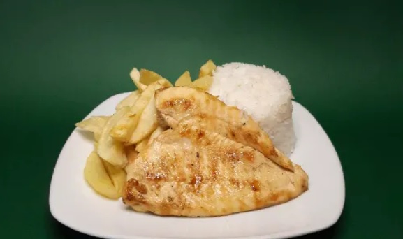 Pechuga de pollo a la plancha con arroz y papas fritas.
