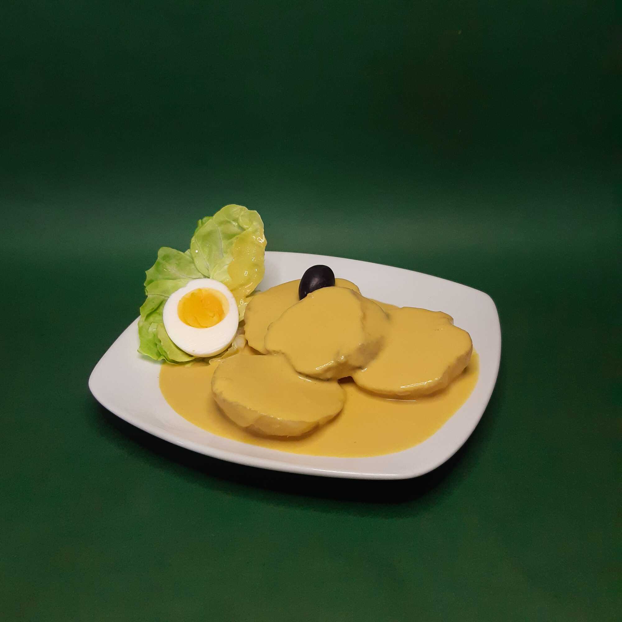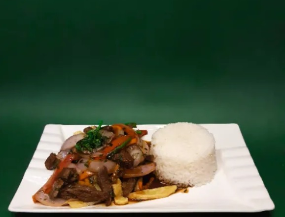 Filete de pescado frito acompañado de arroz, yucas fritas y salsa criolla.