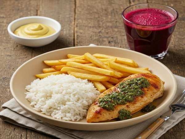 Pollo chimichurri, papa y arroz a escoger. Recomendado con salsa y bebida a elección.