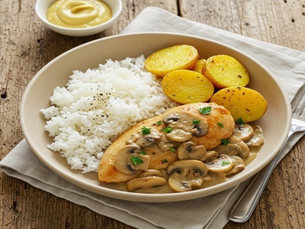 Pollo en salsa de champiñones, papa y arroz a escoger. Recomendado con salsa y bebida a elección.