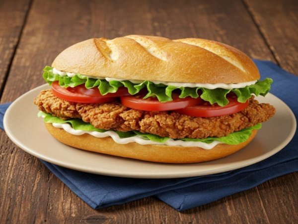 El clásico pan francés con Milanesa de pollo apanada, lechuga romana, tomate y mayonesa.