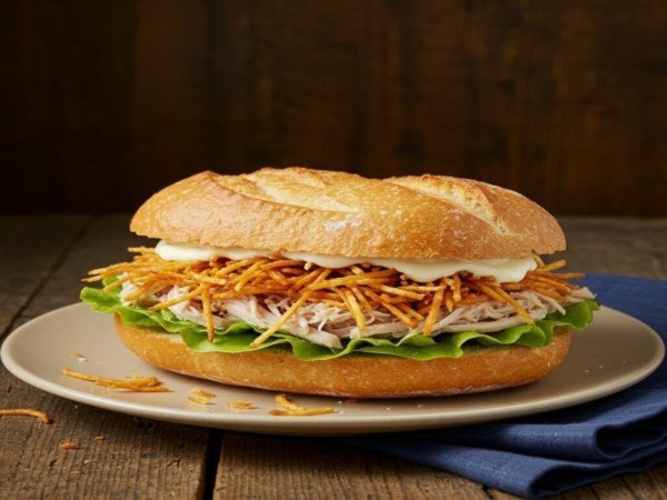 El clásico pan francés con Pollo deshilachado, lechuga romana, papa hilo y mayonesa.