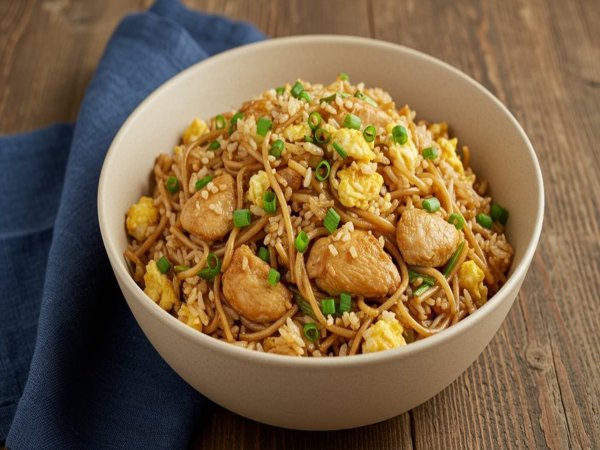 Mezcla de arroz chaufa y tallarín salteados con pollo.