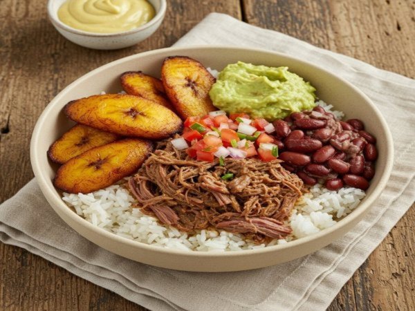 Bowl con Res desmechada, platano bellaco, frejol rojo, guacamole, pico de gallo y arroz a escoger.