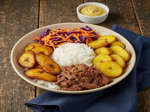 Bowl con Res desmechada, platano bellaco, ensalada de repollo y zanahoria, ketchup, arroz y papa a escoger
