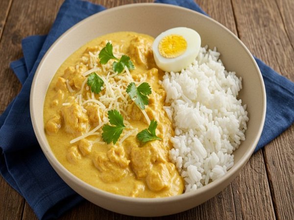 Pollo desmenuzado en salsa de ají amarillo, servido con arroz blanco.