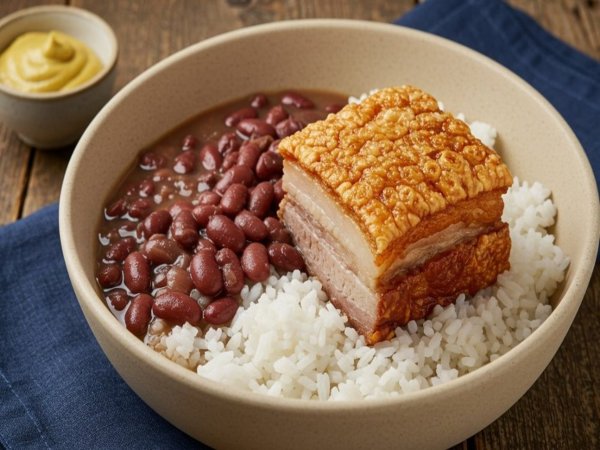Bowl con Panceta de cerdo crocante, frejoles, arroz y salsa a elección.