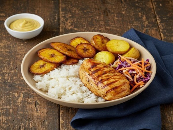 Bowl con Pollo parrillado, platano bellaco, ensalada de repollo y zanahoria, ketchup, papa y arroz a escoger.