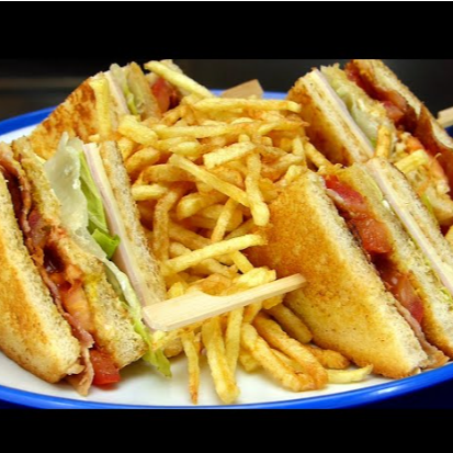Pan de molde, pollo, queso, tocineta, jamón, huevo y papas fritas.