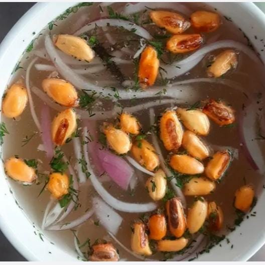 Caldo de pescado cabrilla entero, con fondo de pescado, tomates, cebollas, ají amarillo, yuca y yuyo.