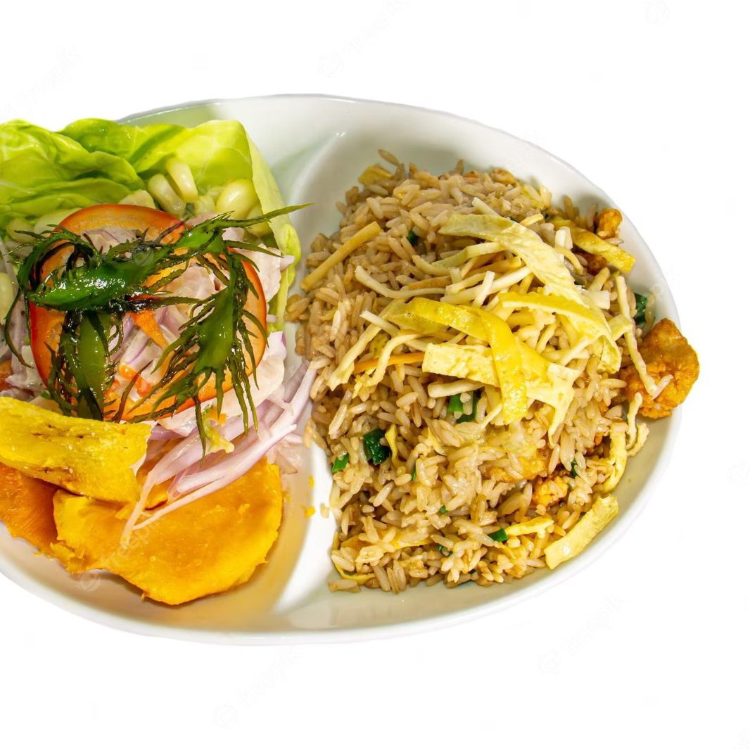 Arroz con estilo risotto en salsa madre misturas de mariscos, alverjitas, zanahorias y sarza criolla.