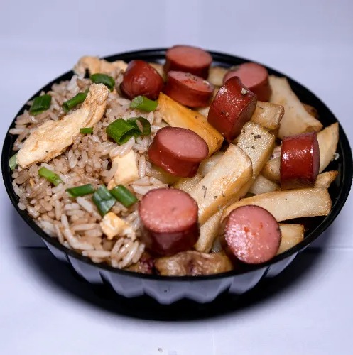 Arroz chaufa al wok, papas fritas, salchicha frankfurter, huevo y cremas.