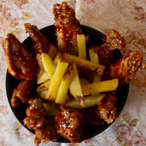6 Piezas de alitas bañadas en salsa BBQ, papas fritas y chaufita + cremas