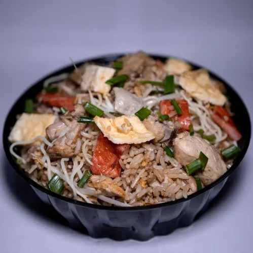 Arroz chaufa con trozos de cerdo, pollo, cecina, huevo, cebolla china, ají y refresco de 300 ml.