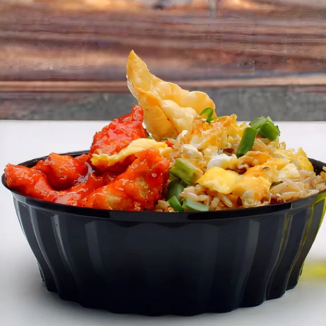 Arroz chaufa con pollito empanizado frito ..bañado en salsa de tamarindo + 2 wantanes