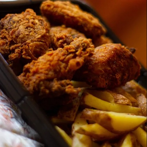 Pierna de pollo en trozos marinado con toke chalaco .con yucas doradas y sarsita chalquita