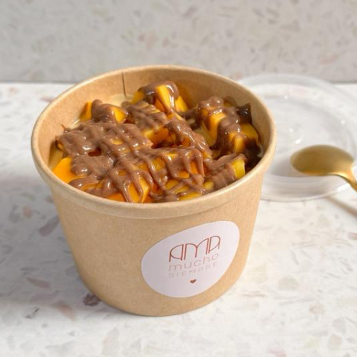 Base de galleta vainilla con mousse artesanal de mango decorado con más mango picado y fudge, postre fresquito para verano