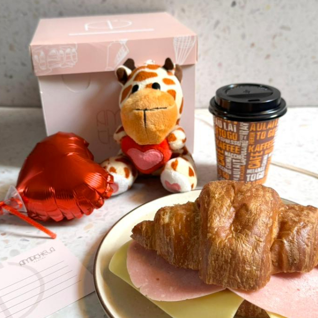 Sorprende con un lindo detalle que incluye un croissant a elección, café americano, peluche según stock, globo corazón y tarjeta para dedicatoria
