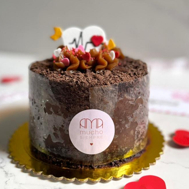 Queque húmedo de chocolate relleno con manjar de olla bañado con fudge y decorado con virutas de chocolate, manjar blanco y pastillaje temático, incluye tarjeta para dedicatoria