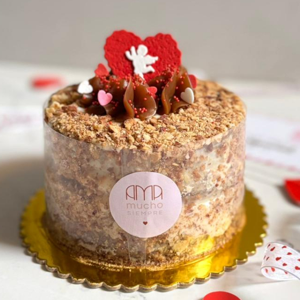Queque húmedo de zanahoria relleno con manjar de olla, bañado con frosting y decorado con manjar blanco, almendras tostadas y pastillaje temático, incluye tarjeta para dedicatoria