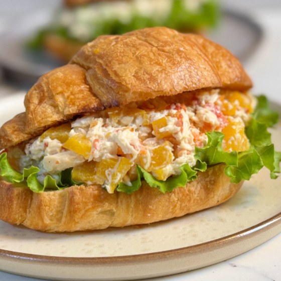 Pan croissant, pollo picado con durazno, tocino, mayonesa y lechuga