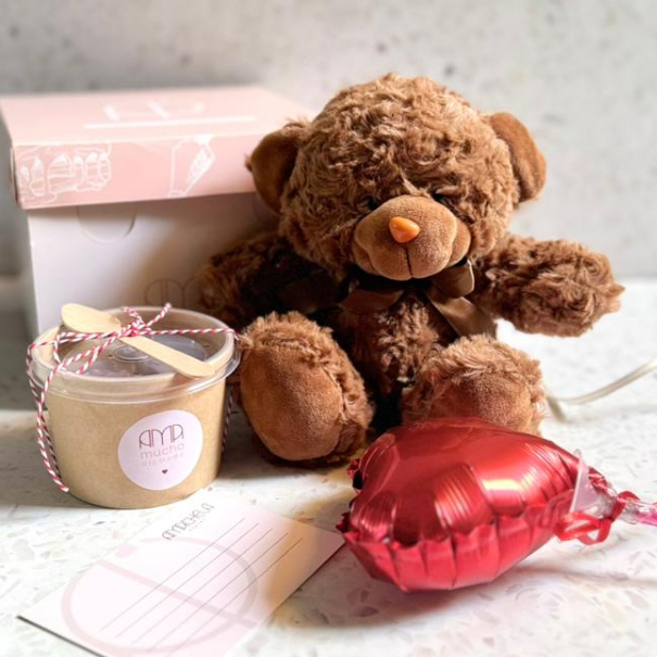 Dulce detalle que incluye un oso de peluche según stock, globo corazón, tarjeta para dedicatoria, cucharita de madera y cuchareable a elección