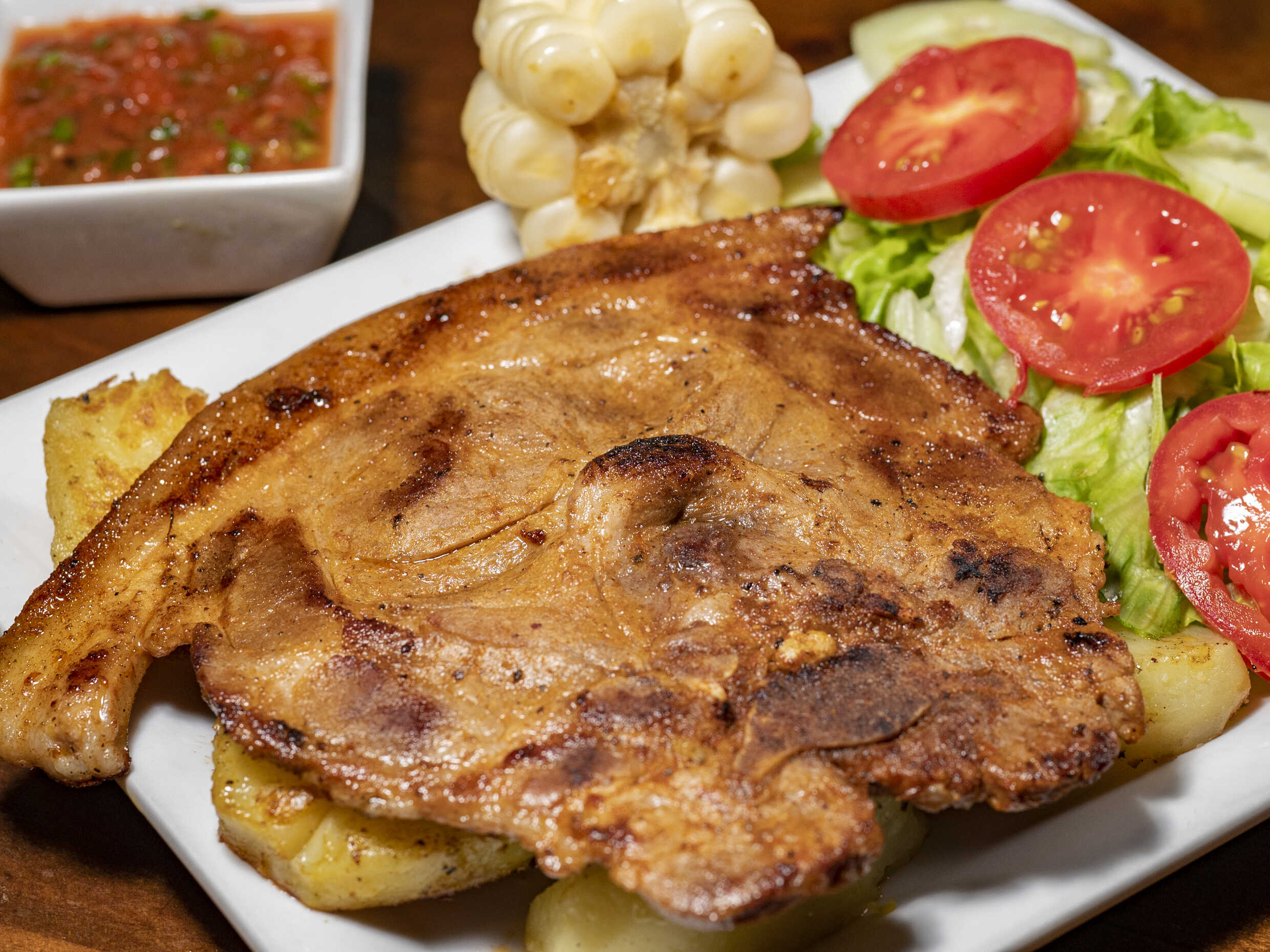 Chuleta de cerdo, ensalada ( lechuga, tomate y pepinillo), papa sancochada, choclo, ají de la casa y rocoto parrillero.