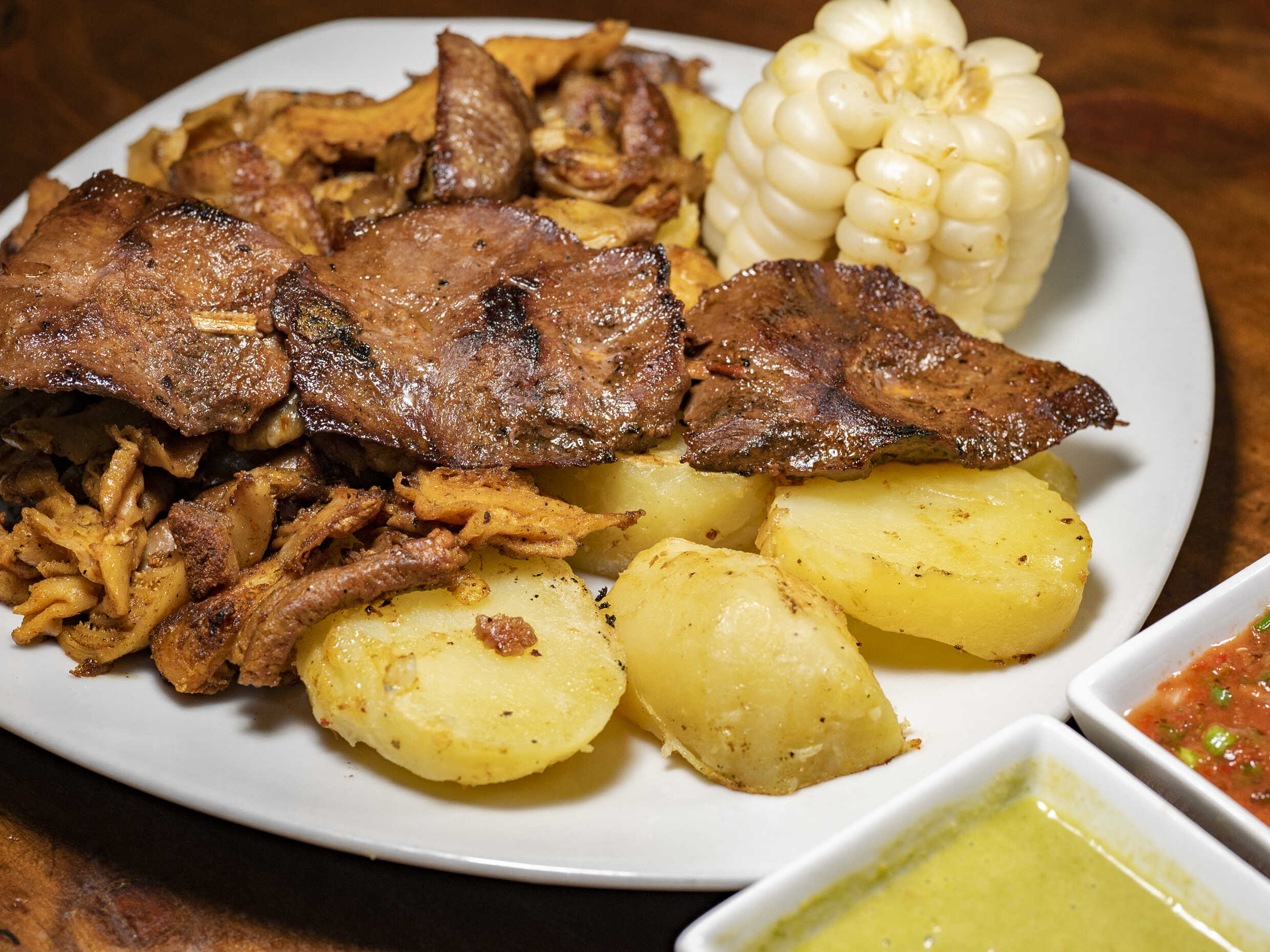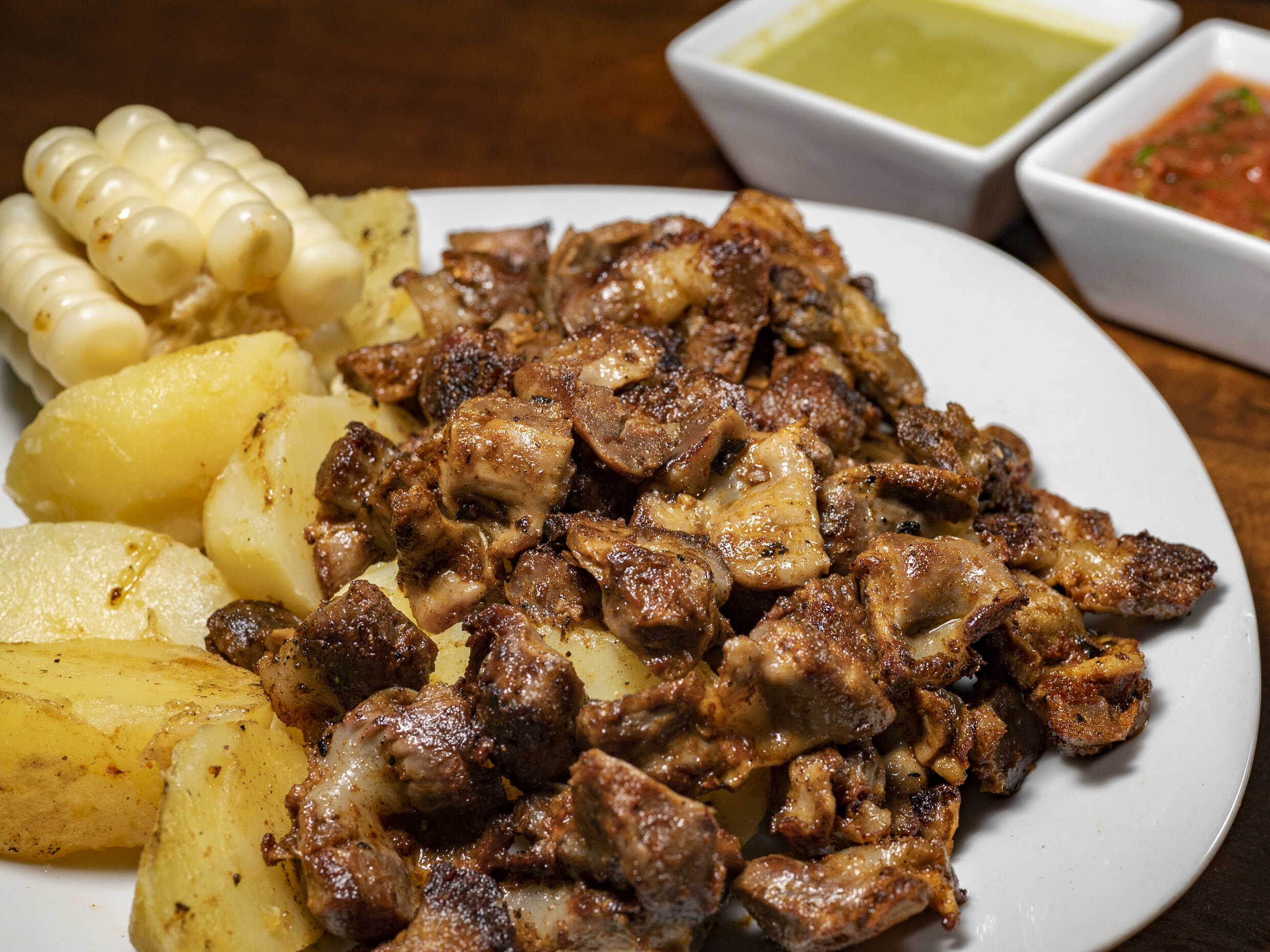Mollejitas de pollo, papas sancochadas, choclo, ají de la casa y rocoto parrillero.