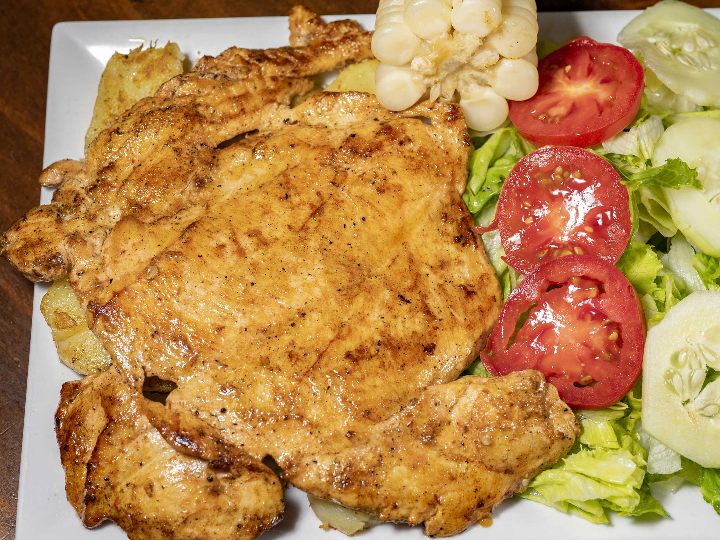 Fileta de pechuga de pollo, ensalada ( lechuga, tomate y pepinillo) papa sancochada, choclo, ají de la casa y rocoto parrillero.