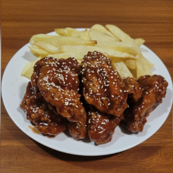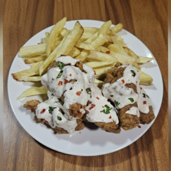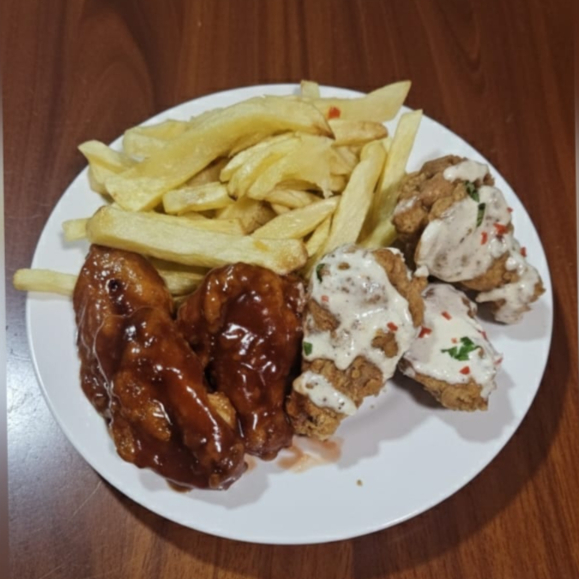 1 pieza de alita broaster + papas fritas + cremas