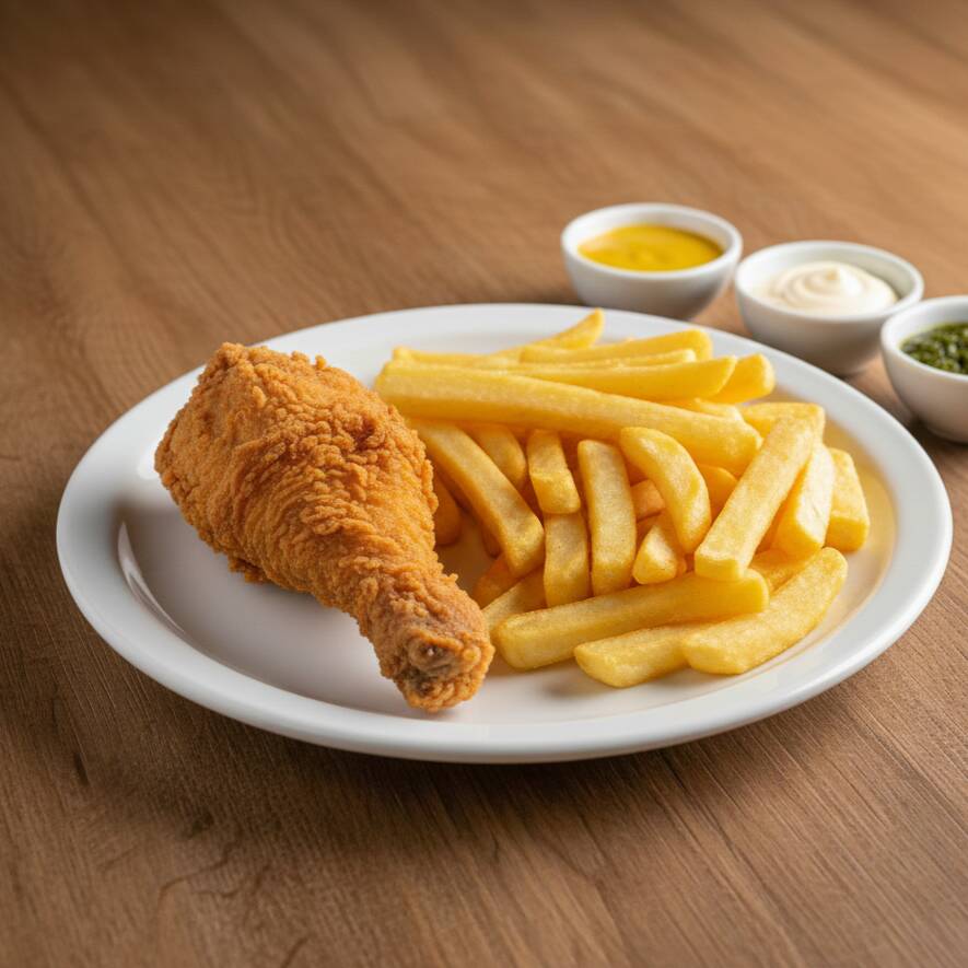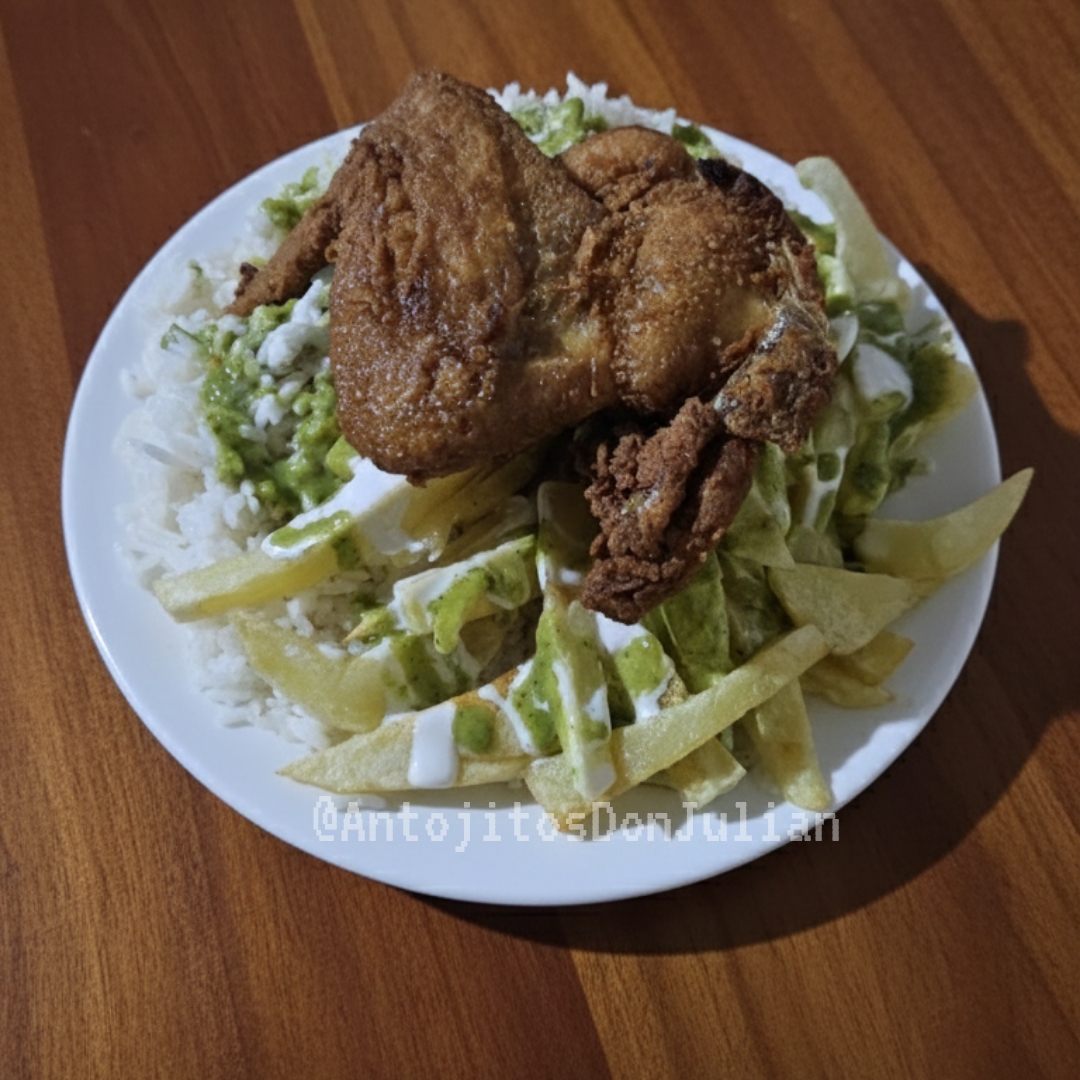 Porcion de papas y arroz (opcional) + 1 presa parte pierna + cremas