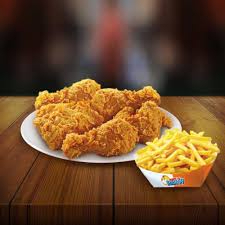 4 Piezas de pollo con papas fritas, ensalada y cremas a elección.