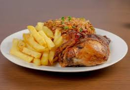 1 Pieza de pollo, papas fritas acompañadas de arroz chaufa casero.