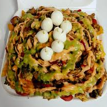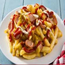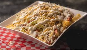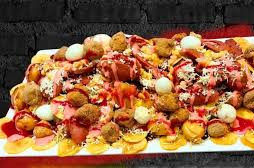 Papas fritas, hot dog, chorizo, filete de pollo, huevo frito, queso, peperoni y choribrasa.