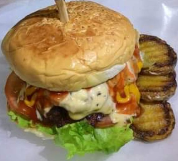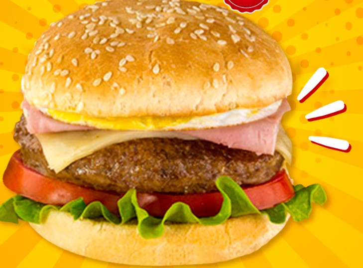 Hamburguesa carne.pan binbo,huevo,jamón,queso,papa,ensalada.