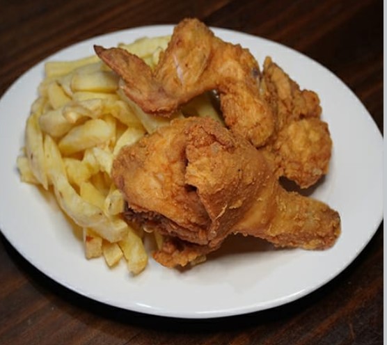 2 piezas pollo Broaster, papa, ensalada, cremas.