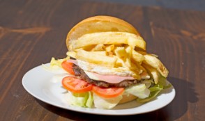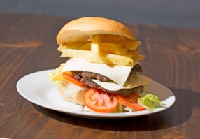 Hamburguesa de carne + queso + papas fritas + ensalada + cremas