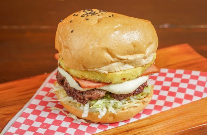 Hamburguesa con 125 g de carne de res artesanal, queso Milán, tocino, acompañado de 150 g de papas fritas, cremas a elegir, mayonesa, kétchup, ají y mostaza.