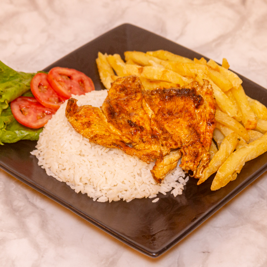 filete broaster + chaufa + papas fritas + huevo + hot dog + cremas.