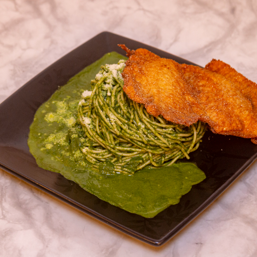 Milanesa de pollo frita + papas fritas acompañad con arroz y cremas