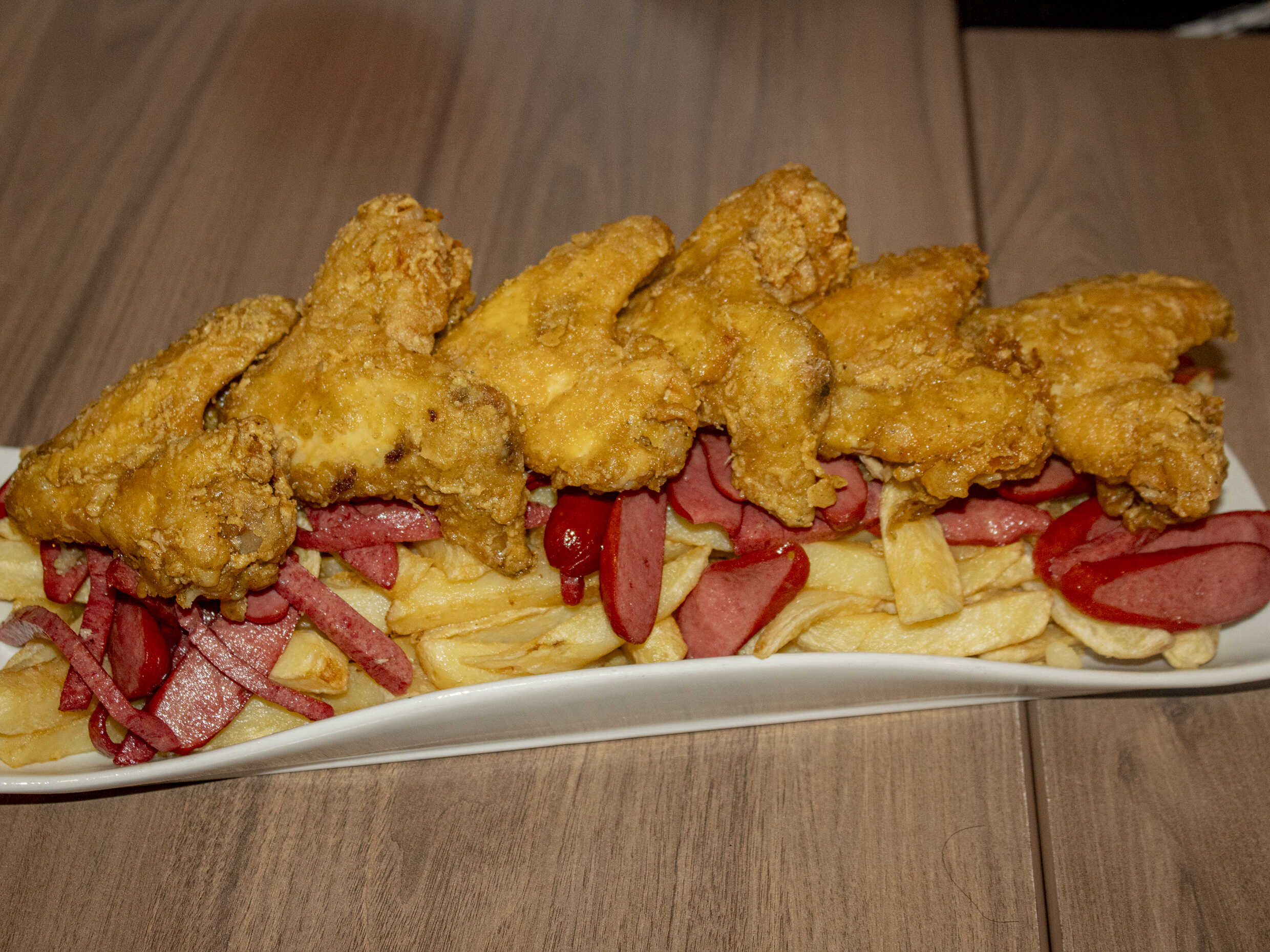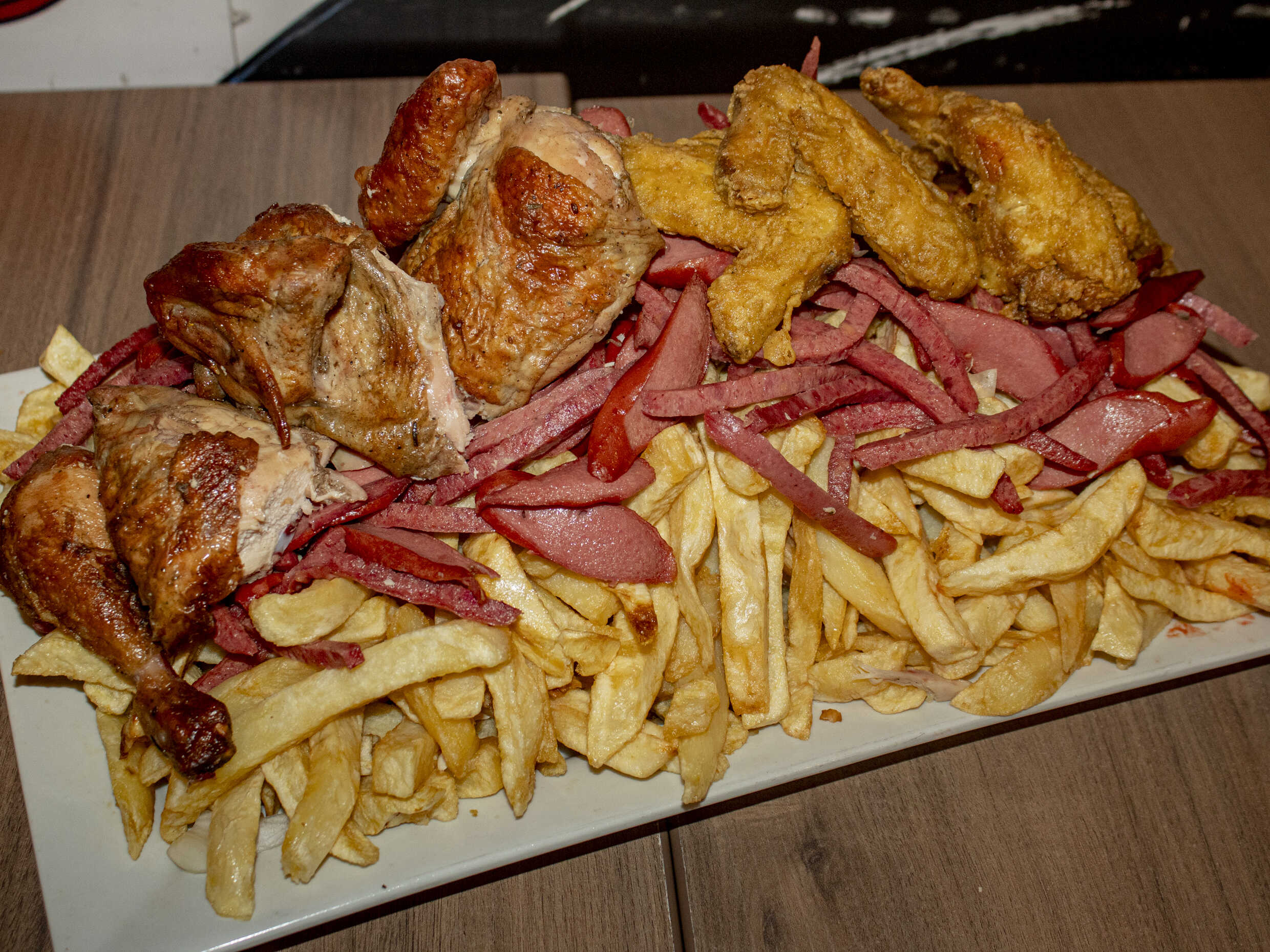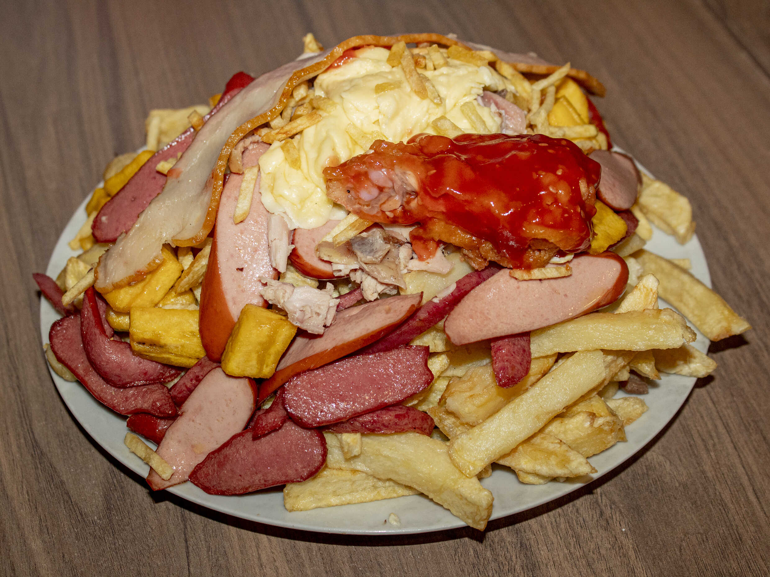 1 kg De papas fritas, hot dog, chorizo, 2 huevos fritos, 2 quesos, 2 tocinos, 2 alas broaster más 1/2 plátano frito.