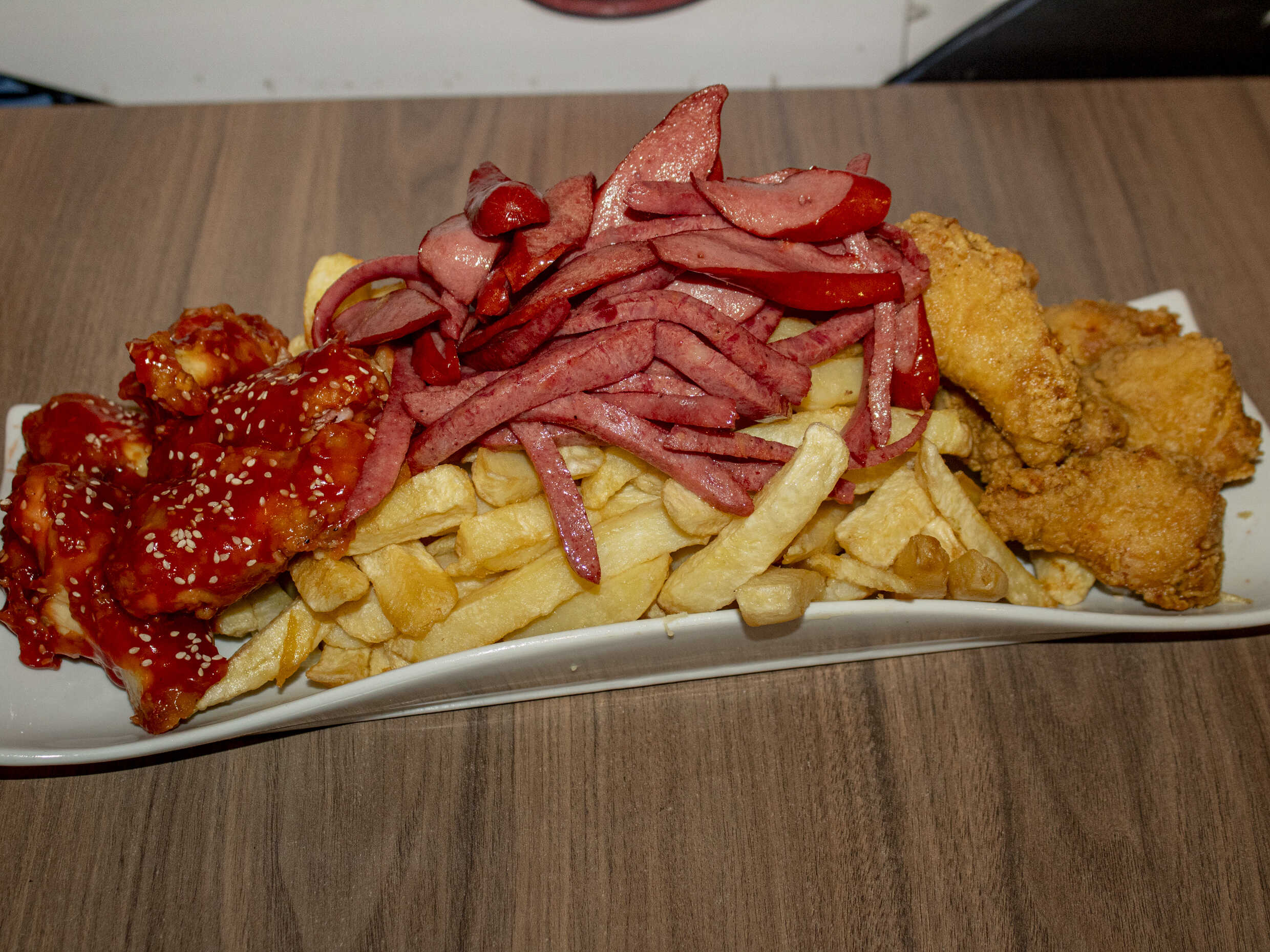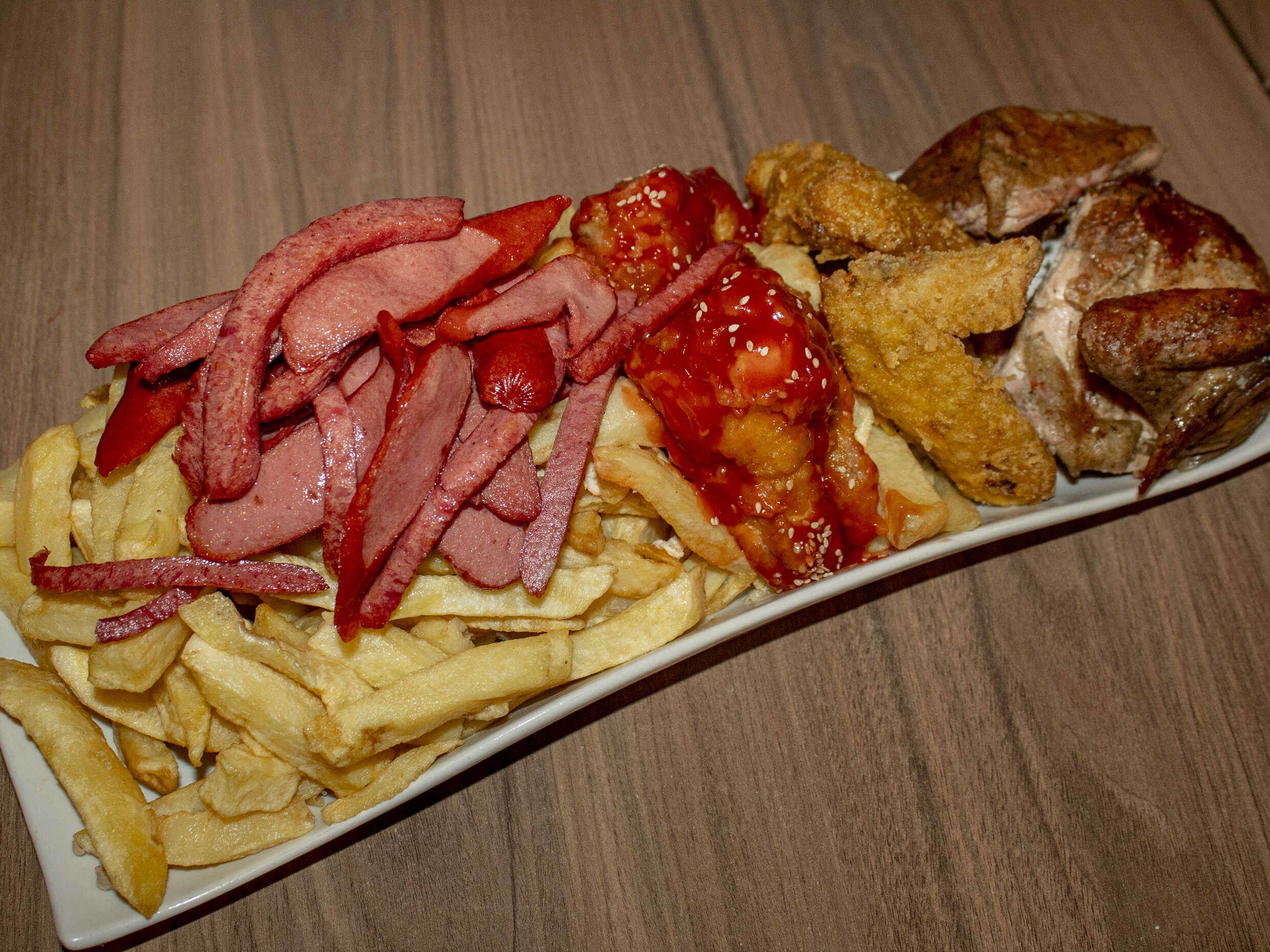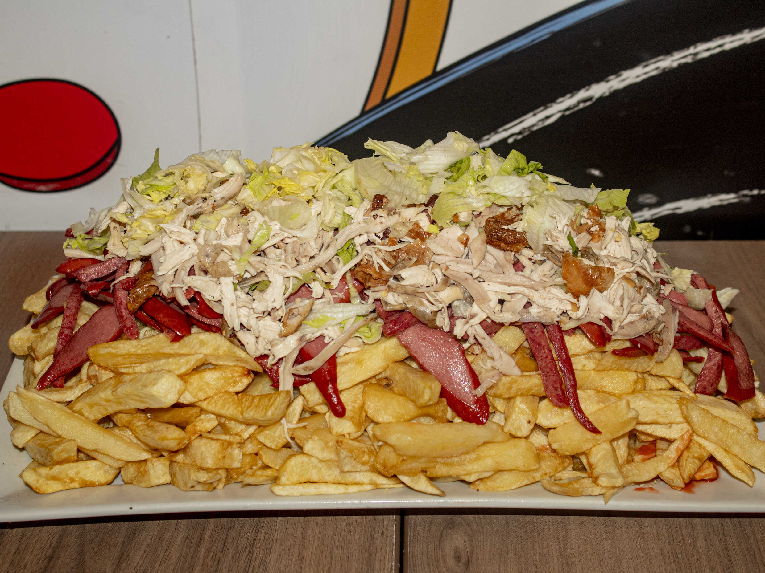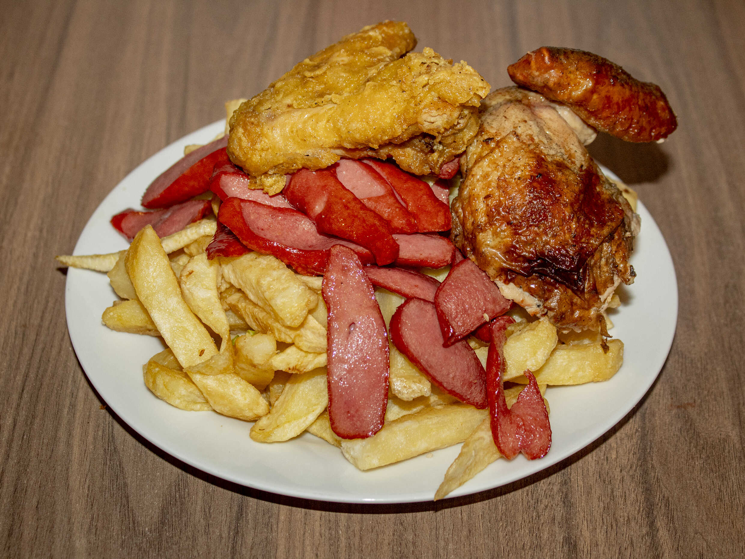 1 kg De papas fritas, hot dog, chorizo, 2 huevos fritos, 2 quesos, 2 tocinos, 2 alas broaster más 1/2 plátano frito.