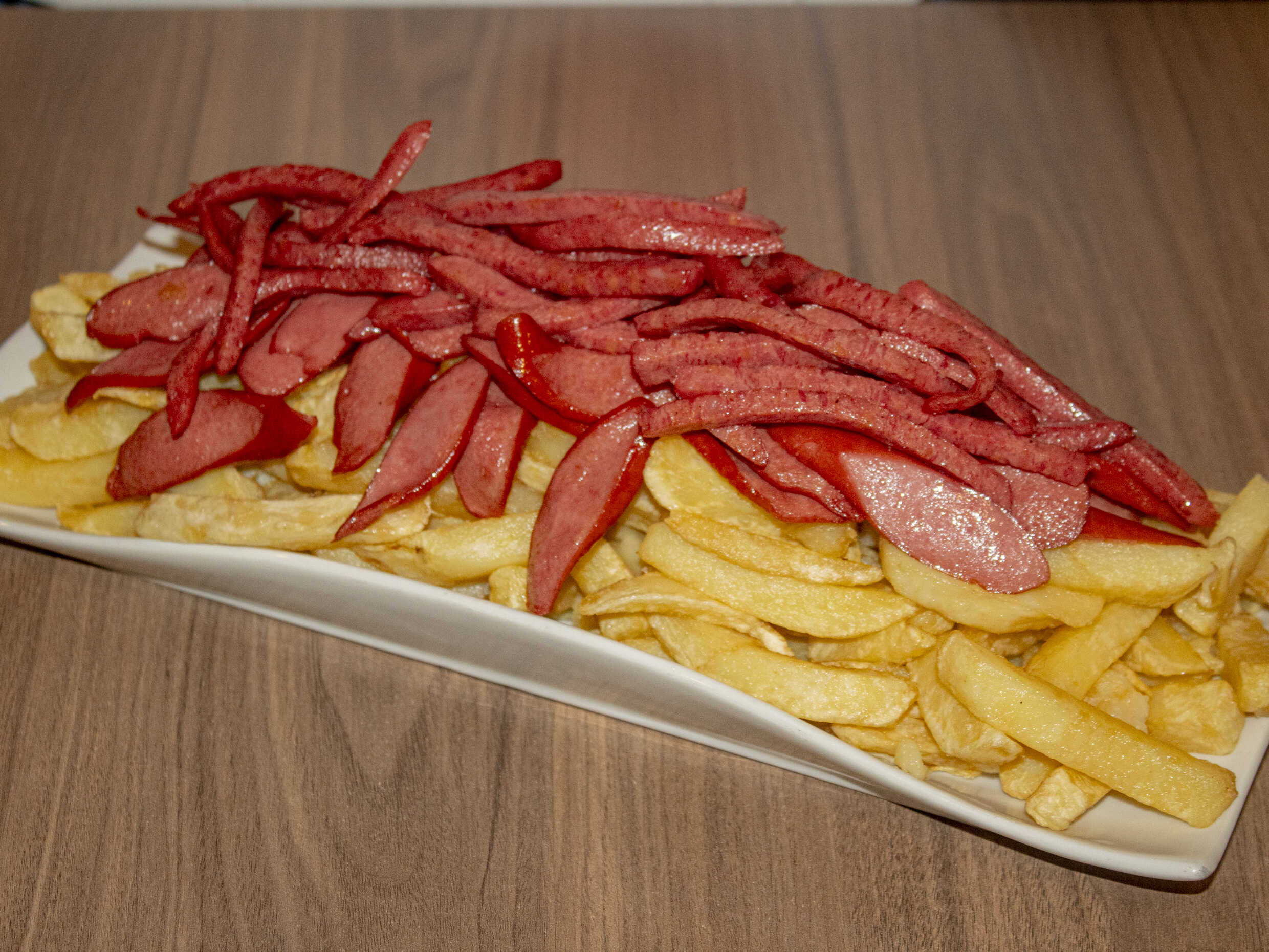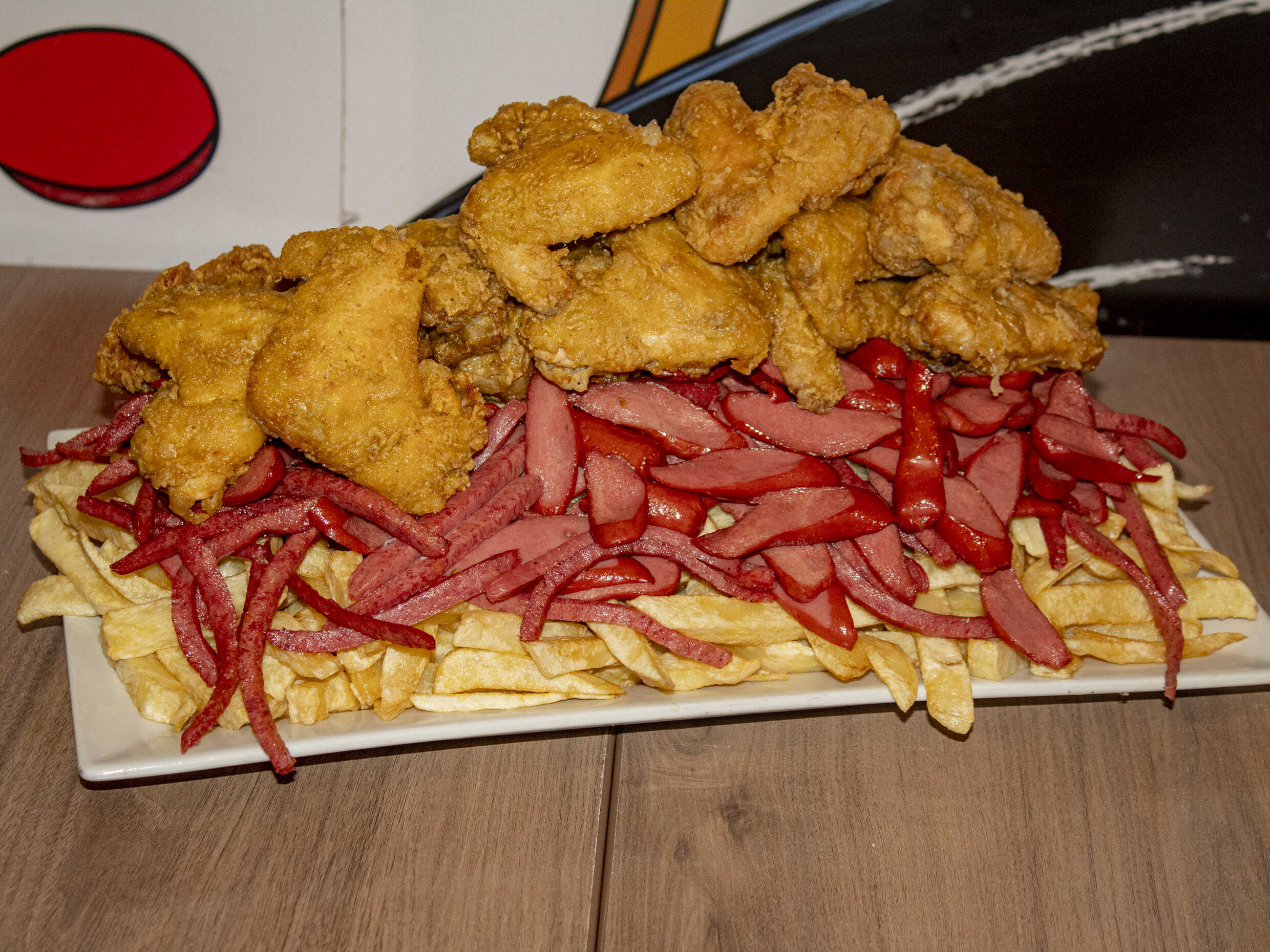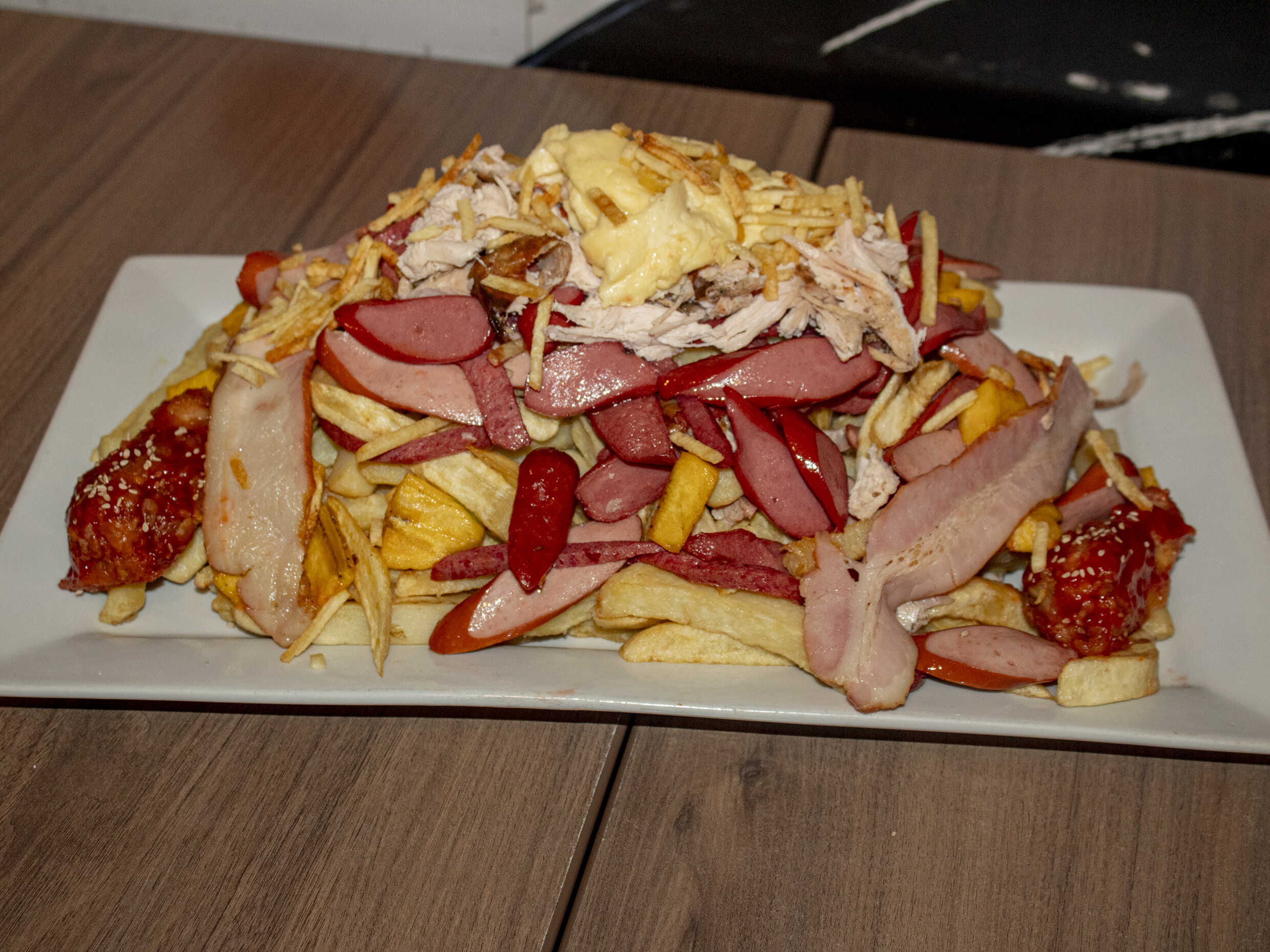1 kg De papas fritas, hot dog frankfurter, salchicha vienesa, 2 tocinos, pollo a la brasa deshilachado, papitas al hilo, 1 alita BBQ, plátanos fritos más 200 g de queso mozzarella.