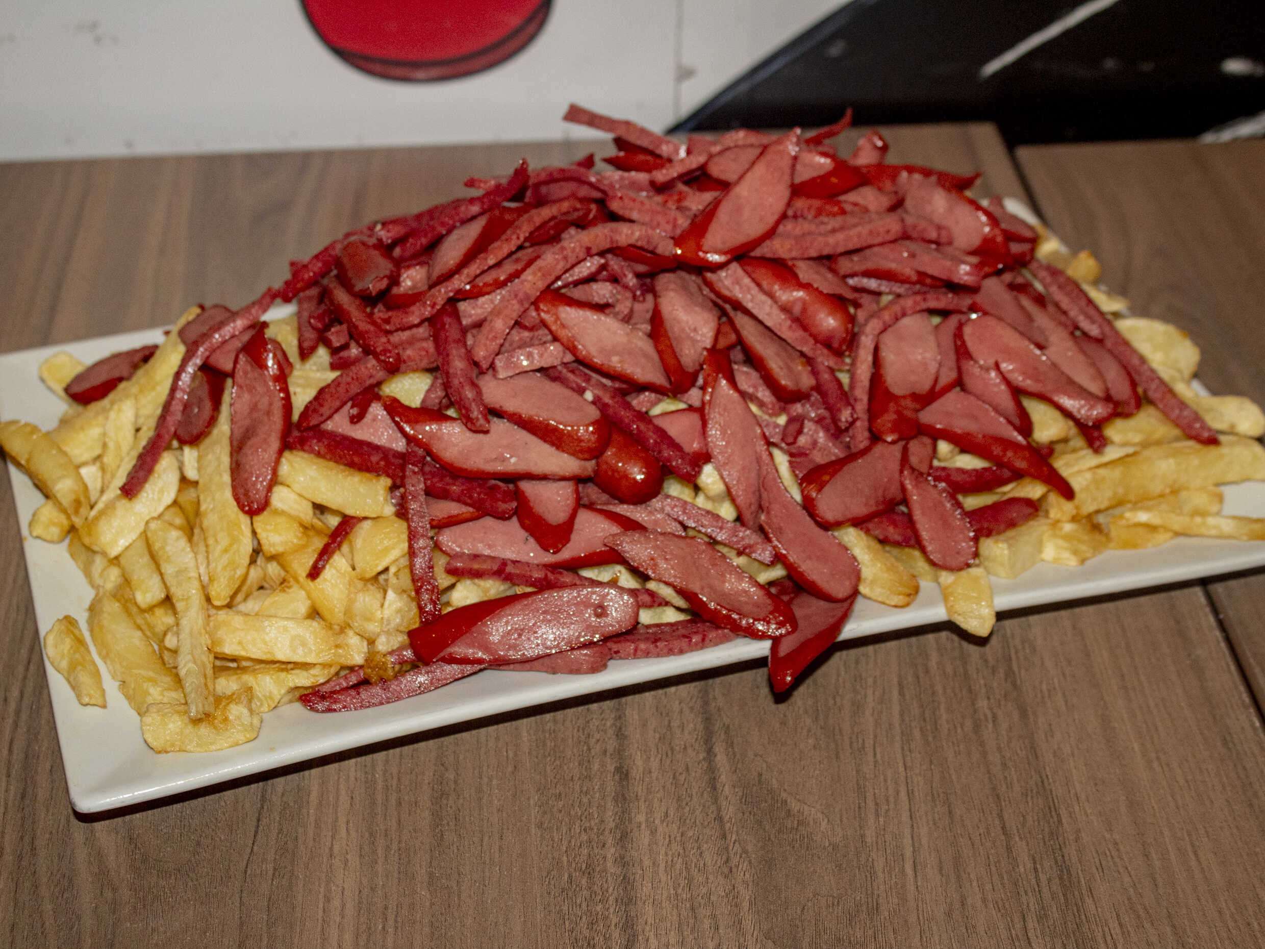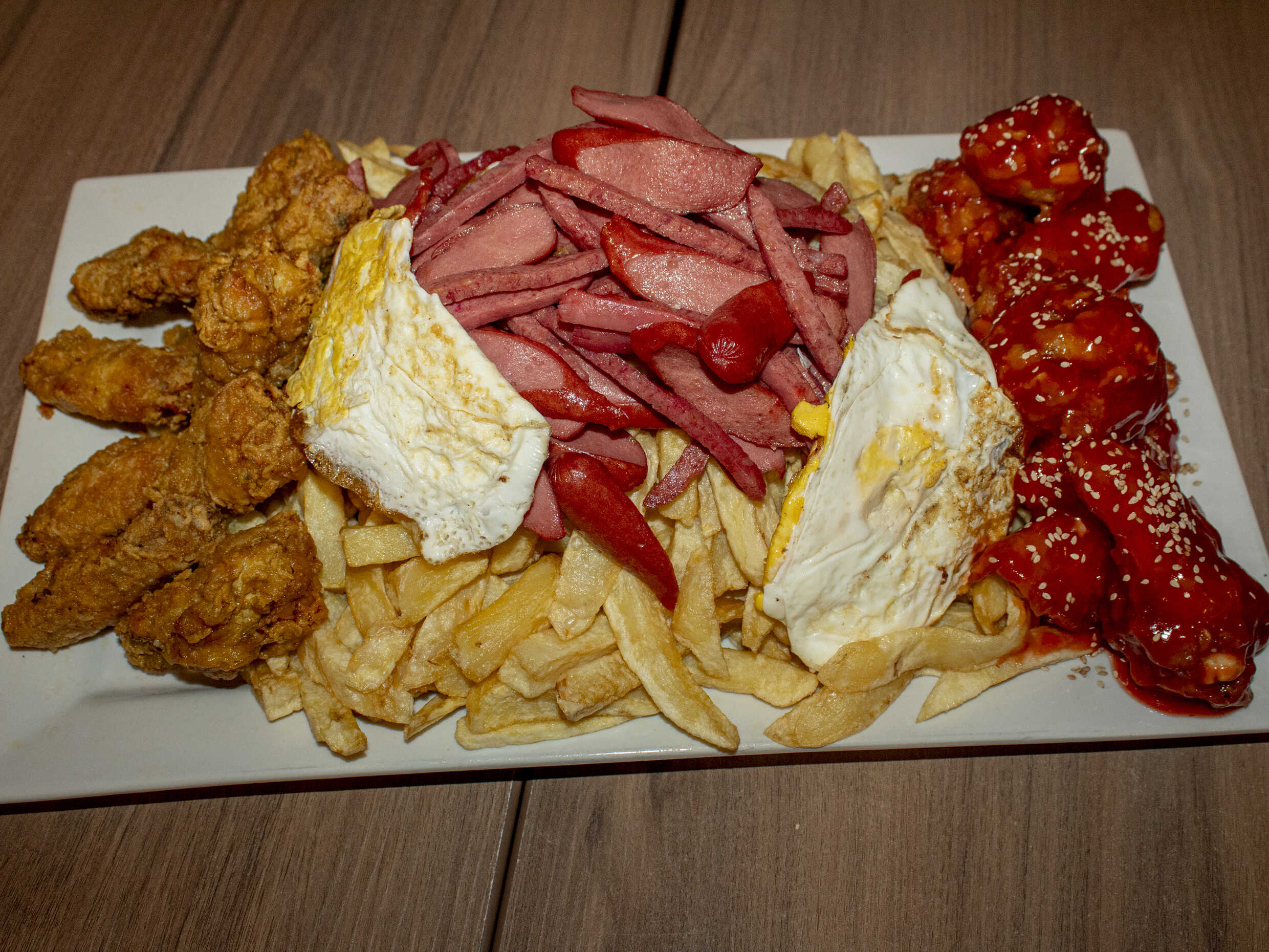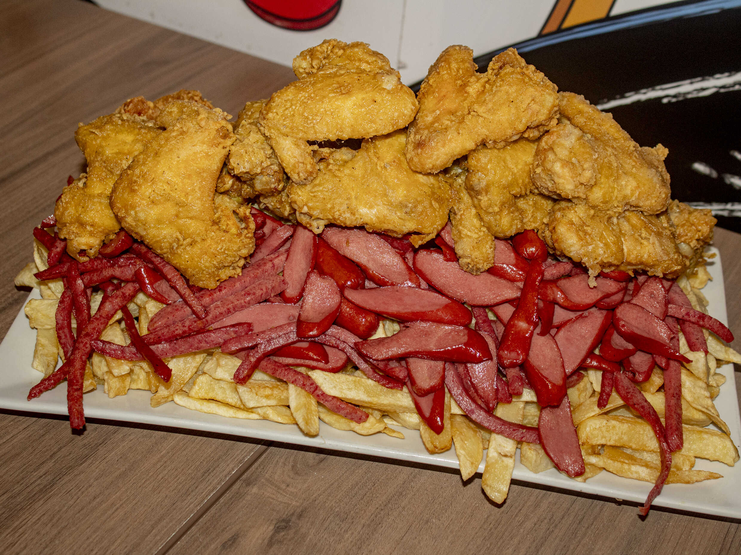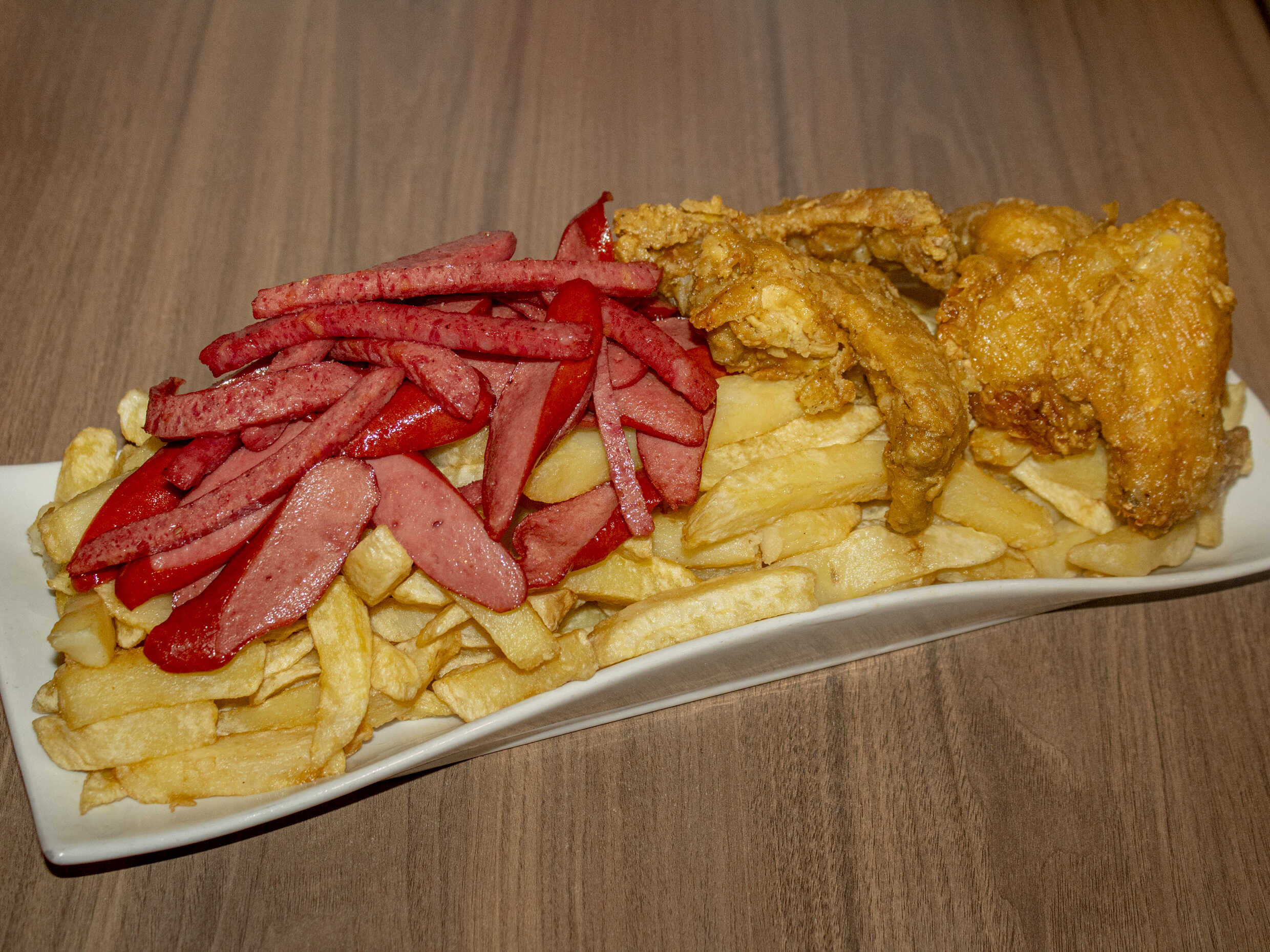 1 kg De papas fritas, hot dog frankfurter, salchicha vienesa, 2 tocinos, pollo a la brasa deshilachado, papitas al hilo, 1 alita BBQ, plátanos fritos más 200 g de queso mozzarella.