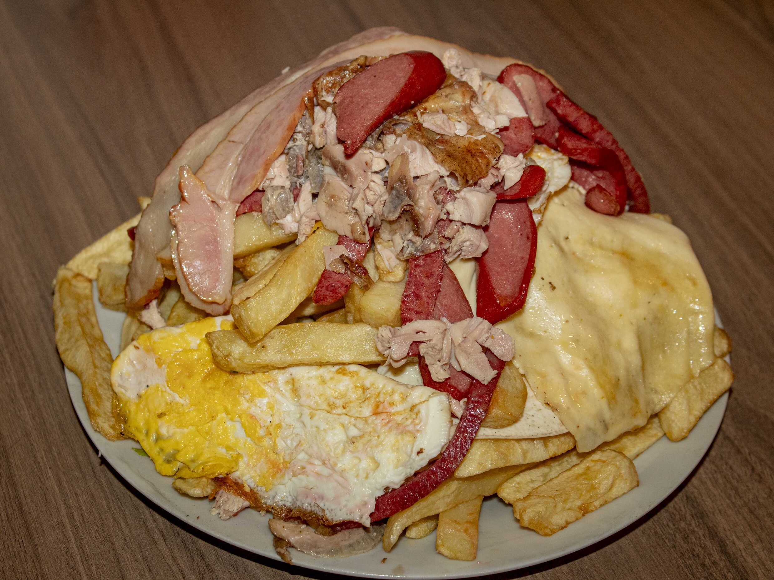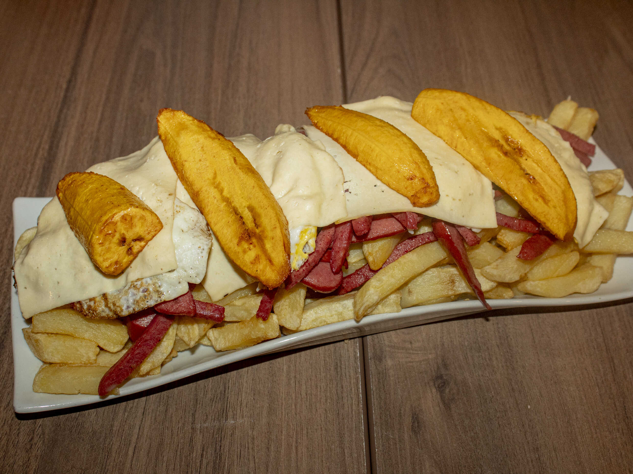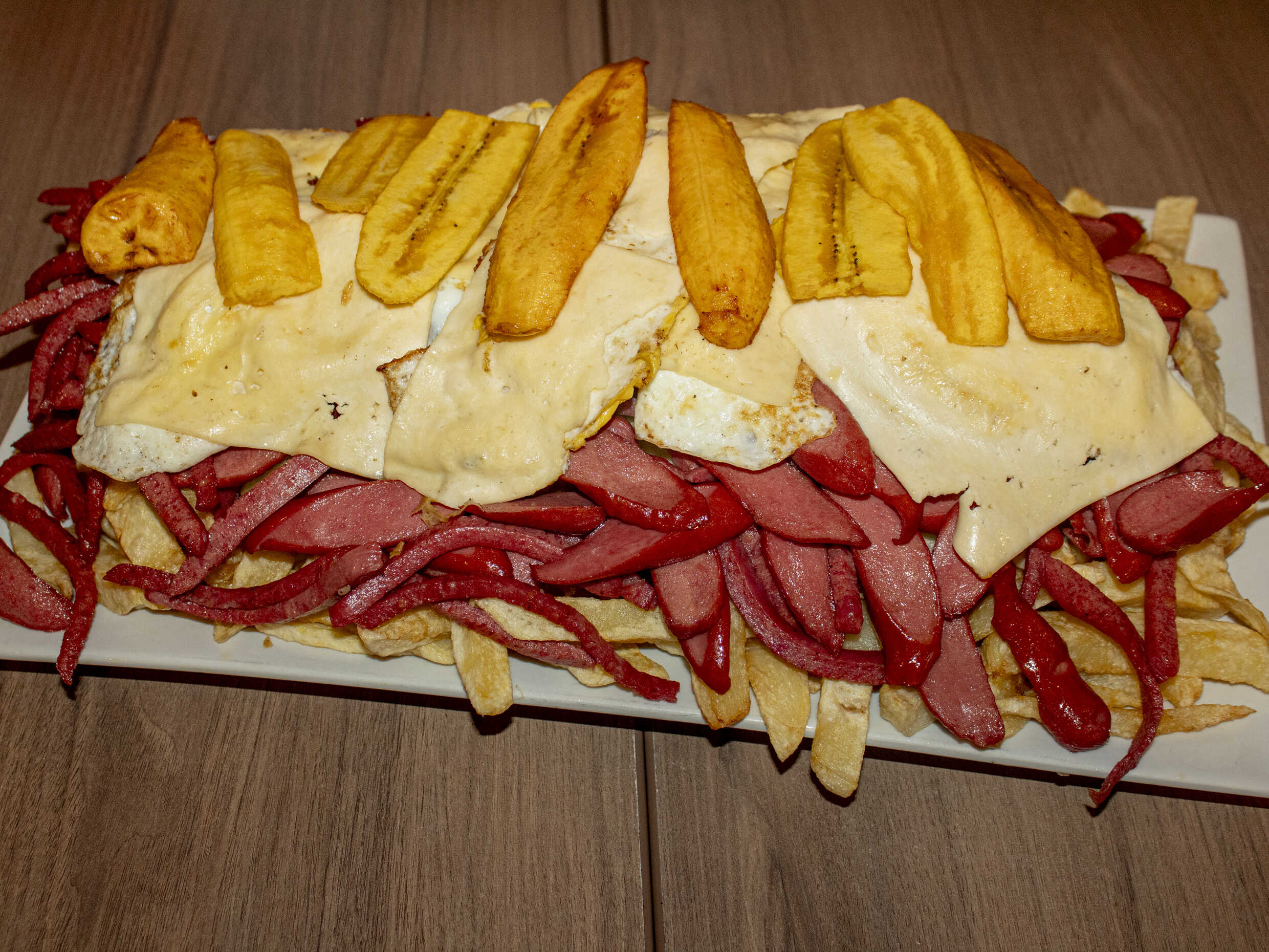 1 kg De papas, 1/4 de salchicha, 1/4 de chorizo, 4 huevos, 4 quesos más 1/2 plátano frito.