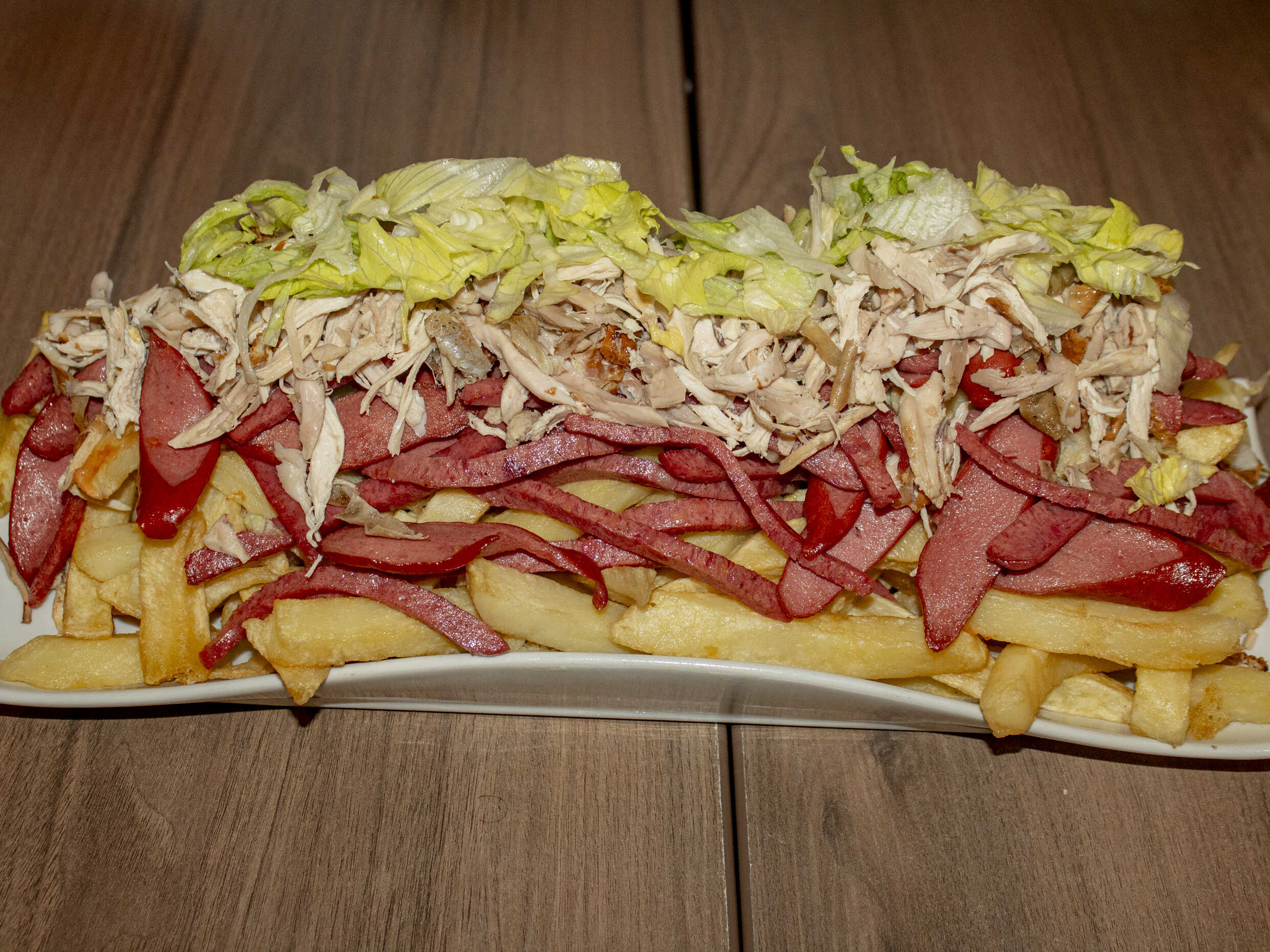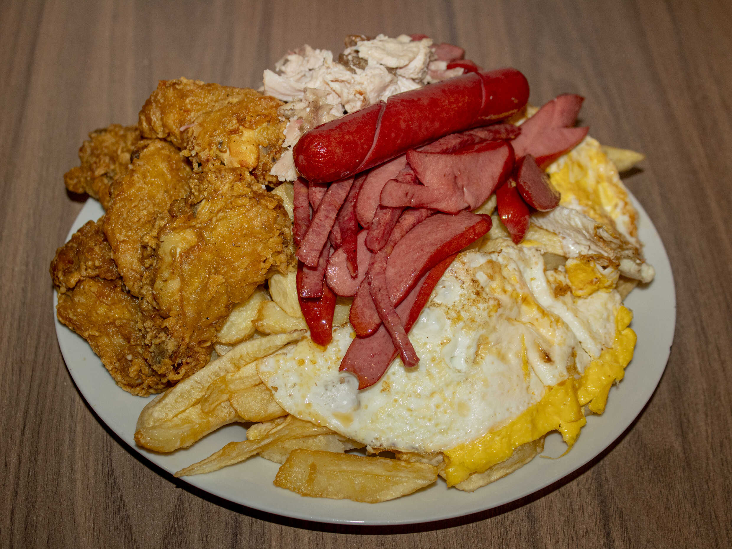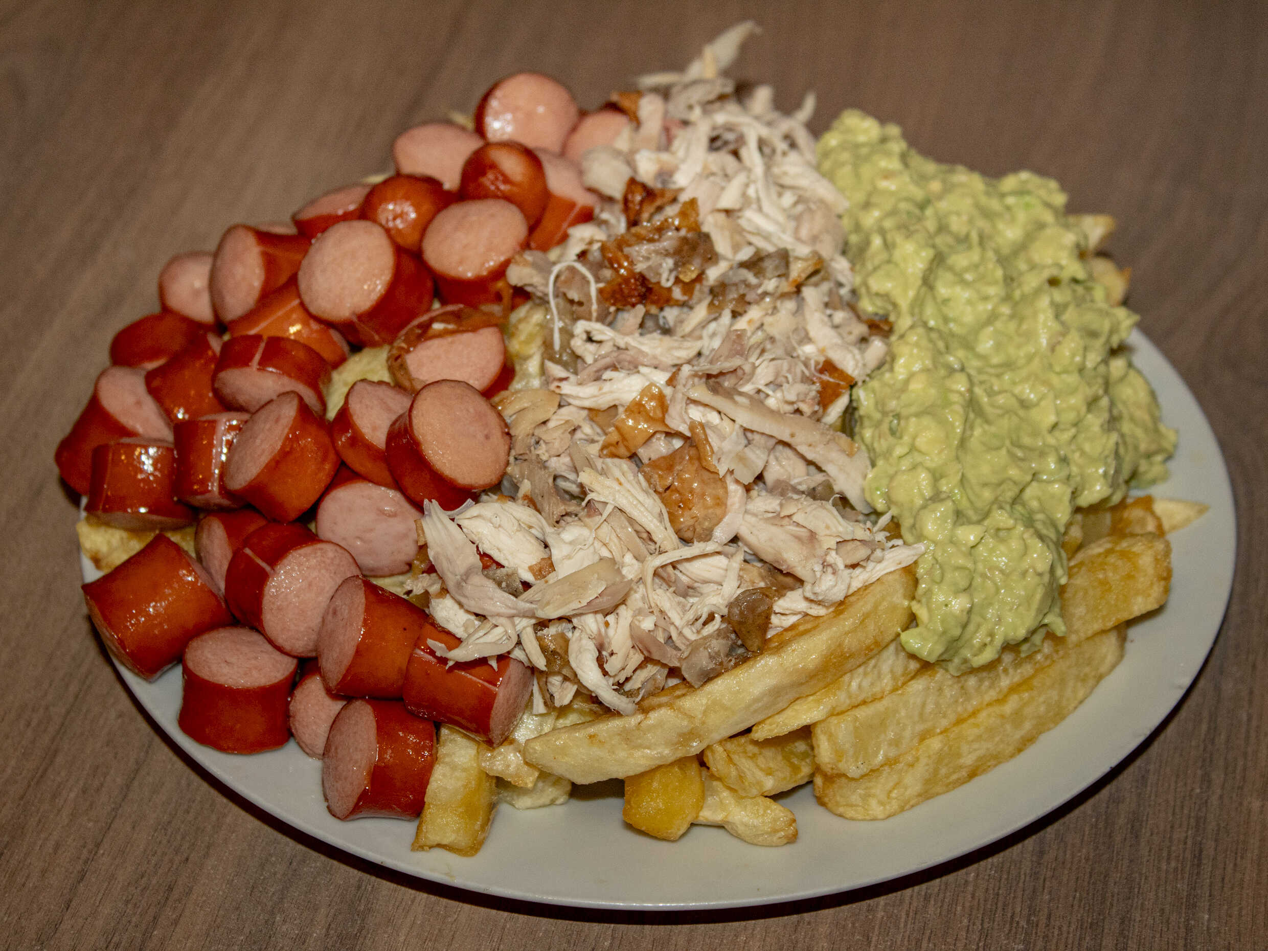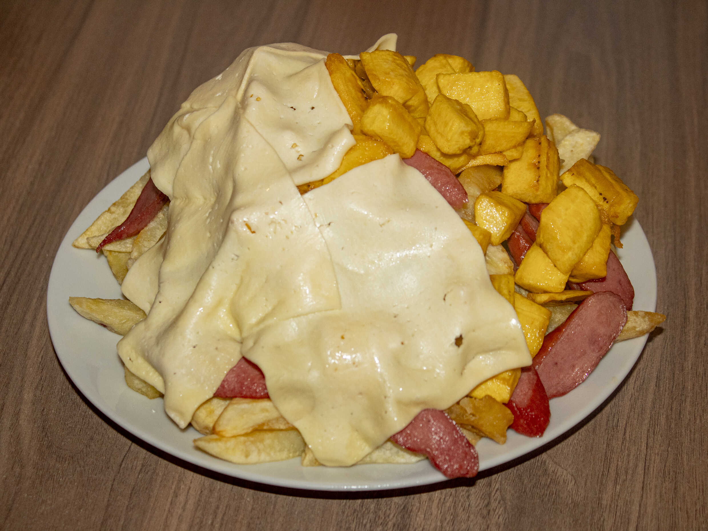 1 kg De papas, 1/4 de salchicha, 1/4 de chorizo, 4 huevos, 4 quesos más 1/2 plátano frito.