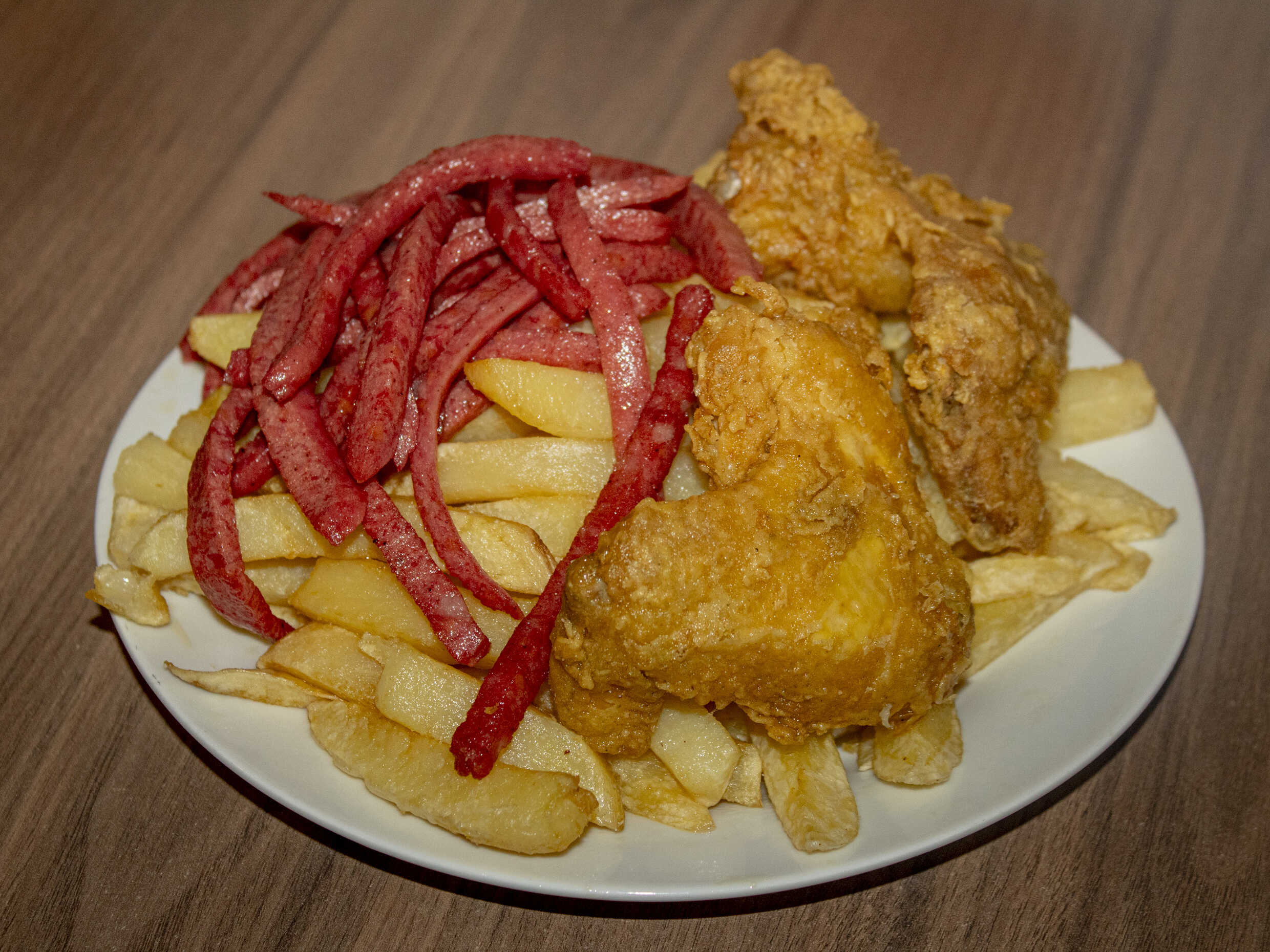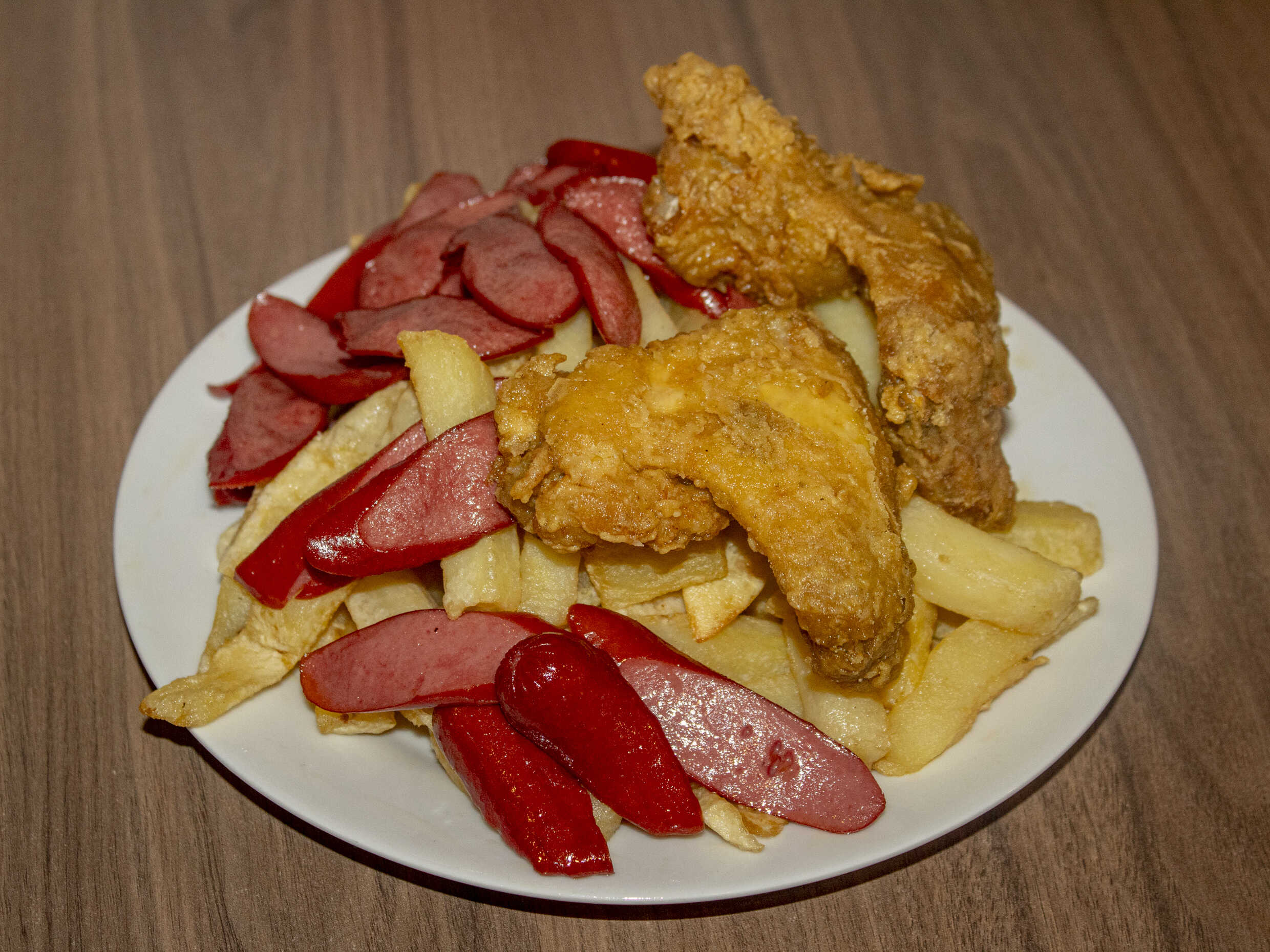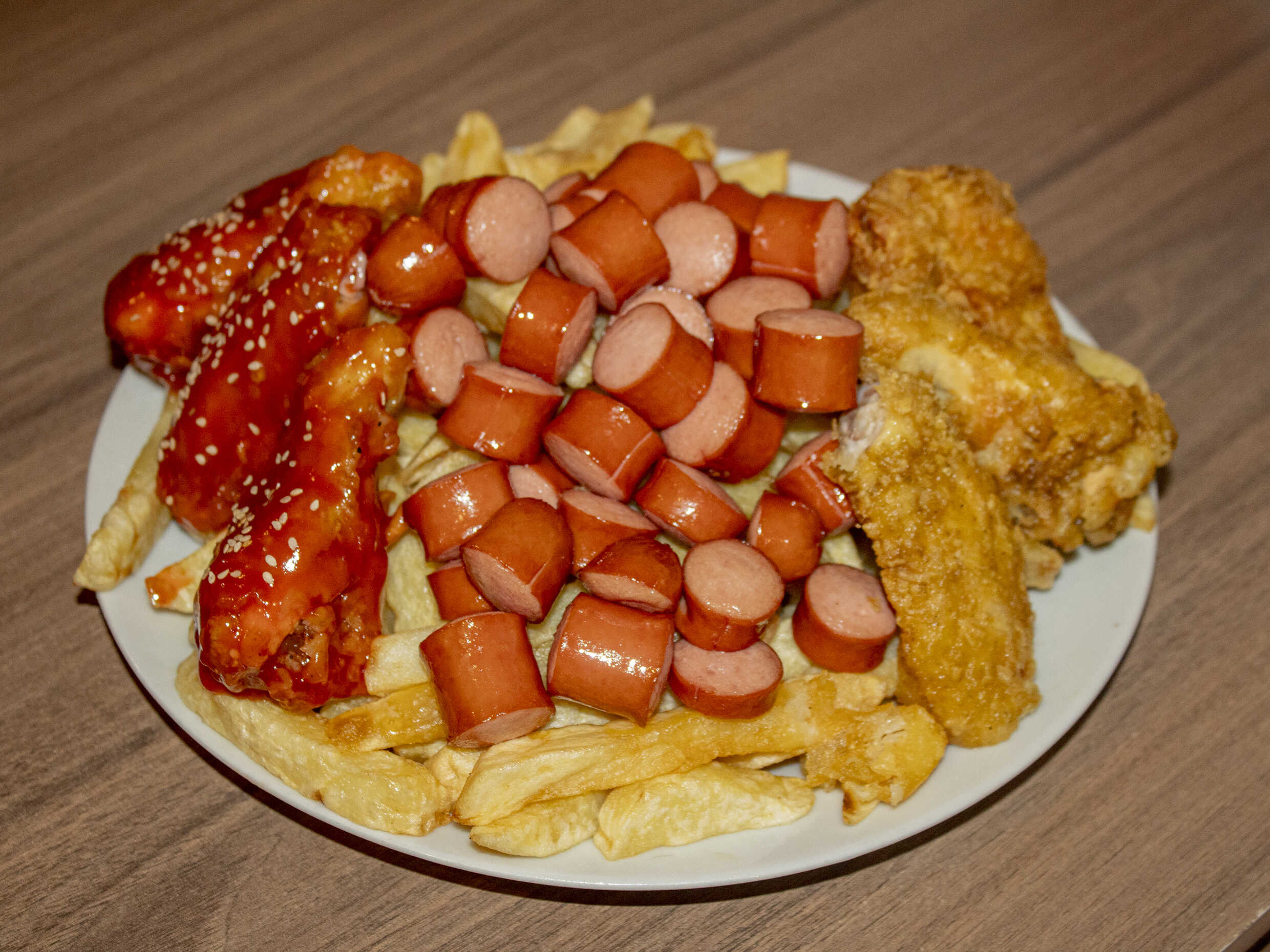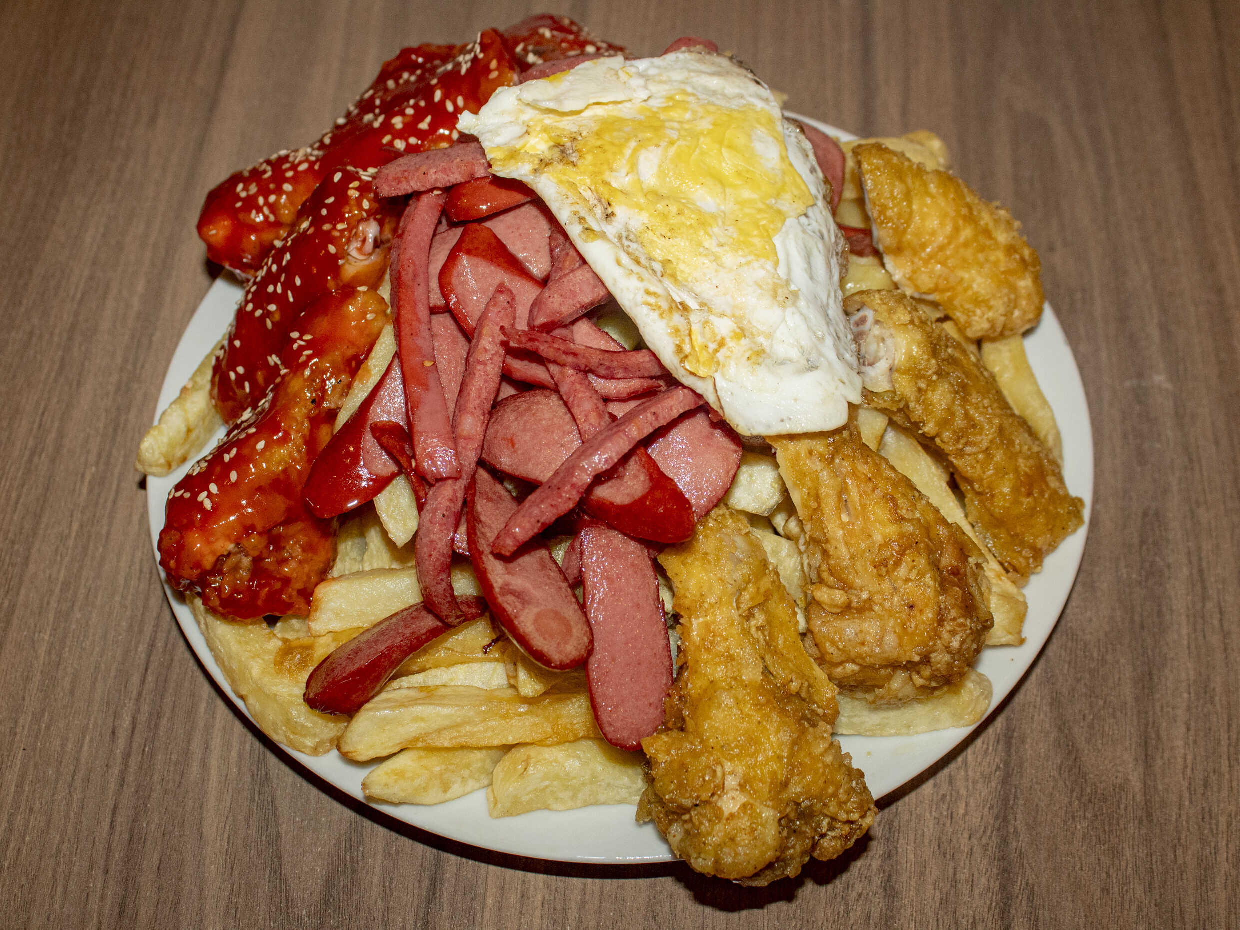 1 Kg de papas, chorizo, 2 huevos fritos, salchicha vienesa, pollo a la brasa deshilachado, 1 salchicha entera más 5 piezas de alitas broaster.