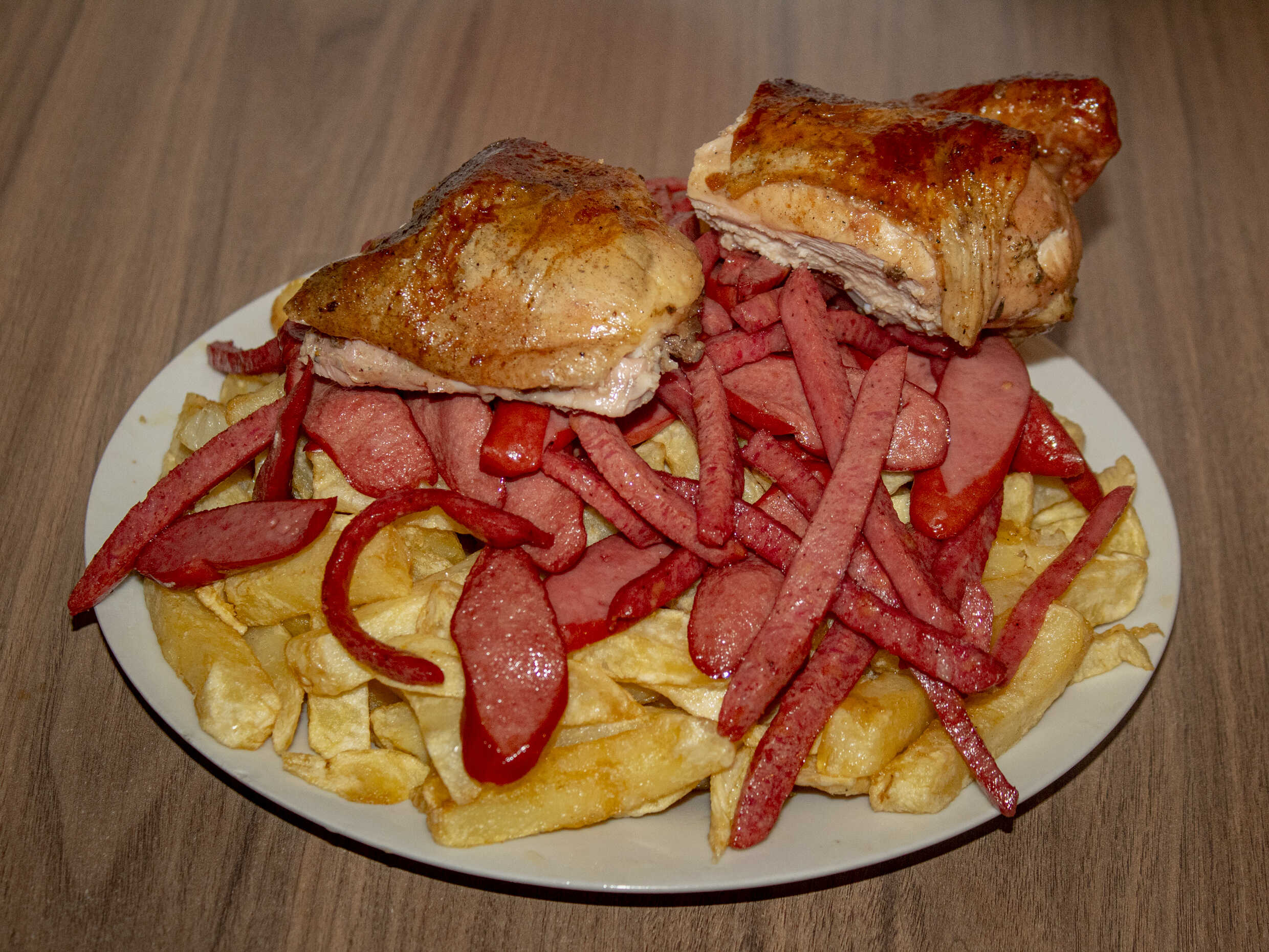 2 kg De papas, 1/2 kg de hot dog, 1/2 kg de chorizo más 1/2 pollo a la brasa (4 octavos).